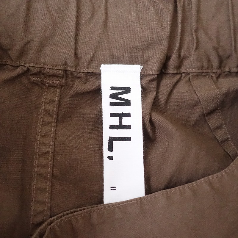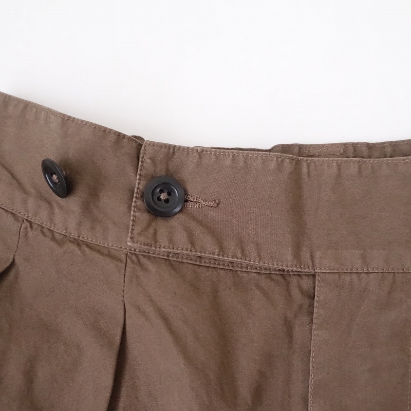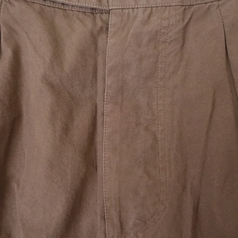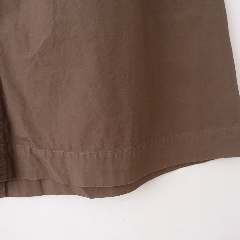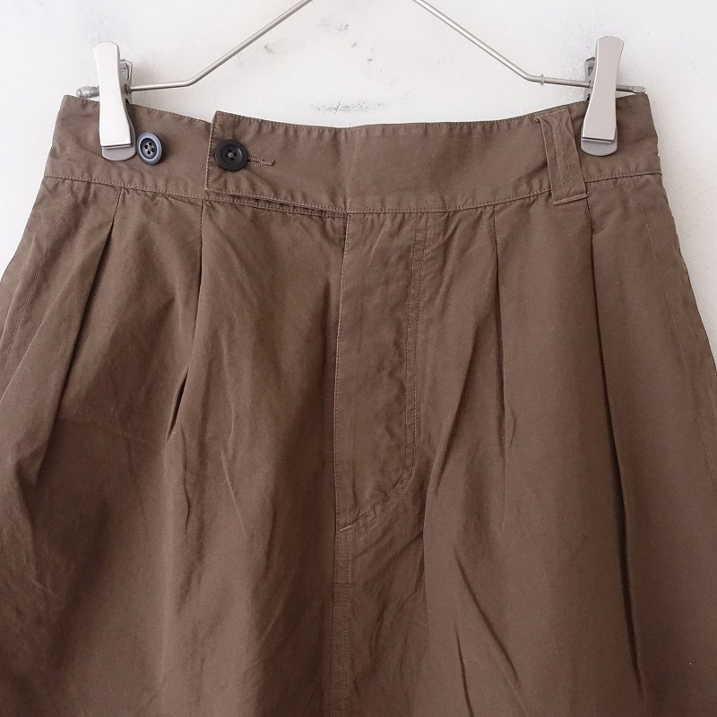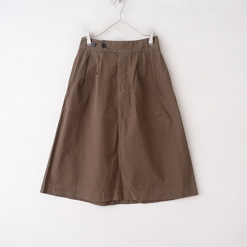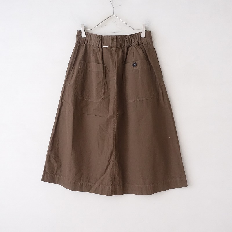 | MHL.のFINE COMPACT COTTON POPLIN スカートです。カラーはブラウンで、ややハリのある布帛地です。フロントにツータック入りのフレアデザインで、フロントの2段階ボタン・内ボタン&比翼ボタンで着脱でき、バックウエストにゴム入りです。腰両サイドにシームポケット&ヒップ左右にパッチポケットがあり、裏地は付いておりません。 |