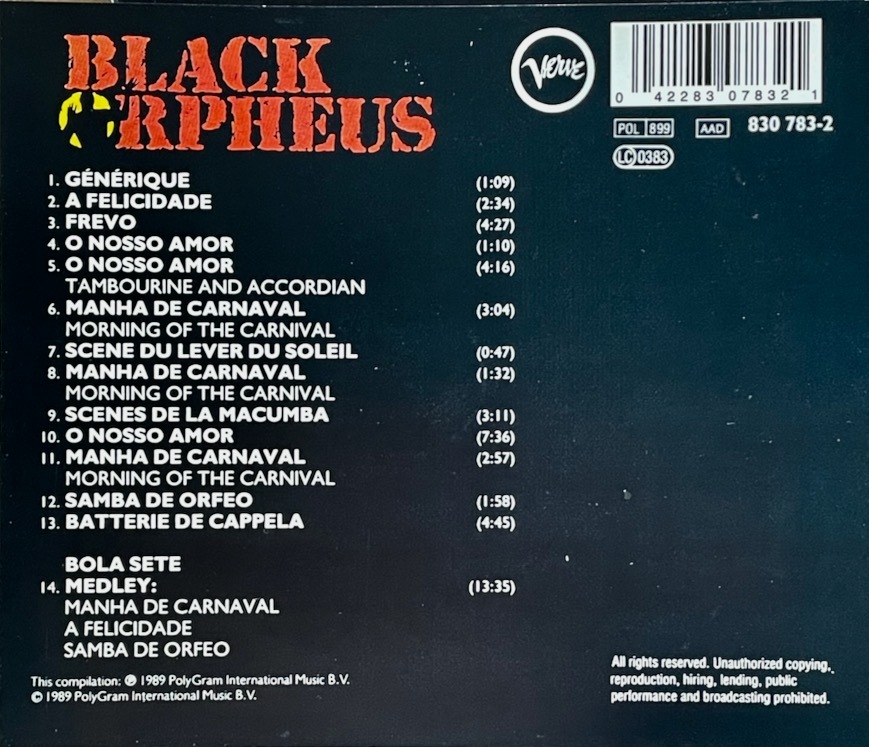 ------------------------------------------------- アーティスト:アントニオ・カルロス・ジョビン/ルイス・ボンファ タイトル:黒いオルフェ/Black Orpheus (Orfeu Negro) 品番:830 783-2 発売年:1989 (C4H) ★★★コンディション★★★ 生産国:US盤 帯:- ケース:交換済み ディスク:NM ブックレット:NM ★★★曲目★★★ 1.Generique 2.A Felicidade 3.Frevo 4.O Nosso Amor 5.O Nosso Amor (Tambourine And Accordian) 6.Manha De Carnaval (Morning Of The Carnival) 7.Scene Du Lever Du Soleil 8.Manha De Carnaval (Morning Of The Carnival) 9.Scenes De La Macumba 10.O Nosso Amor 11.Manha De Carnaval (Morning Of The Carnival) 12.Samba De Orfeo 13.Batterie De Cappela Medley:Bola Sete 14-1.Manha De Carnaval 14-2.A Felicidade 14-3.Samba De Orfeo ★★★解説★★★ *1959年公開(日本では1960年公開)のヴィニシウス・ヂ・モライスによる原作をマルセル・カミュ監督が手掛けた映画『黒いオルフェ』のオリジナル・サウンドトラック。 音楽を担当しているのは、アントニオ・カルロス・ジョビンとルイス・ボンファ。 ボラ・セチによる1966年のメドレーを追加した全14トラック。 --------------------------------------------------------------------- ☆お願い☆ ・他のサイトでも販売している場合がございます。 そちらで売れた際には出品の取り消しをいたしますので、お好みの商品がございましたら、お早めのご落札をおすすめいたします。 ・詳細な記載は割愛させて頂いている場合がございます。 商品内容、曲目等につきましてはお気軽にご質問下さいませ。 ・盤面につきましては、再生に問題のあるようなキズがある商品は出品しておりませんのでご安心下さいませ。 ・研磨痕は出来るだけ記載しておりますが極薄い場合は見落としもありますのでご容赦下さい。 ・きれいな物が多いですが、中古にご理解のある方のみ入札して下さい。 (80年代などの古い商品はジャケット・解説などの紙類が経年劣化が見られる場合が有ります。) ・梱包は、主にビニール袋(防水)+クッション封筒(破損防止)での梱包となります。(規格外サイズの商品は封筒+防水袋+プチプチ) コンディションについて ディスク NEW(未使用品) M(Mint..キズ無しの美品) NM(見た目ほとんどキズなどなしの美品となります(見る角度で微キズ、薄い線キズなどがある場合) EX(若干のスレ、キズ有りますが概ね綺麗/ごく薄い研磨痕など) VG(やや目立つキズ、研磨痕などあり/再生は問題ないもの) ブックレット、ジャケなど NEW(未使用品) M(Mint..キズ無しの美品) NM(見た目ほとんどキズなどなしの美品となります(軽いアタリ,スレ程度はあり) EX(若干のスレ、キズ有りますが概ね綺麗なもの/ケースの噛み痕,軽い折れ癖,背の色褪せなど) VG(折れ、破損、色褪せ、欠損などあり/カット盤) *輸入盤に関しては新品でもジャケの傷みなどある場合あり。生産国によってはジャケなどの紙類の作りが悪い場合あり。 *新品の状態がわからない場合が多いのでわずかな色褪せなどはご容赦ください。 *ボックス、インナーなどの欠品は元の状態がわからない場合は記載しませんので説明欄、掲載写真にてご判断ください。 <発送方法> クリックポスト 最初のお返事は48時間以内に、お取り引きは1週間以内に完了していただけるようにお願いいたします。 ※不在などの大事なお知らせは、自己紹介欄と落札後の自動メールに記載しますので、 自己紹介欄はご入札前に必ずご確認下さい。 他にも多数出品しておりますので、あわせてご覧下さい。
