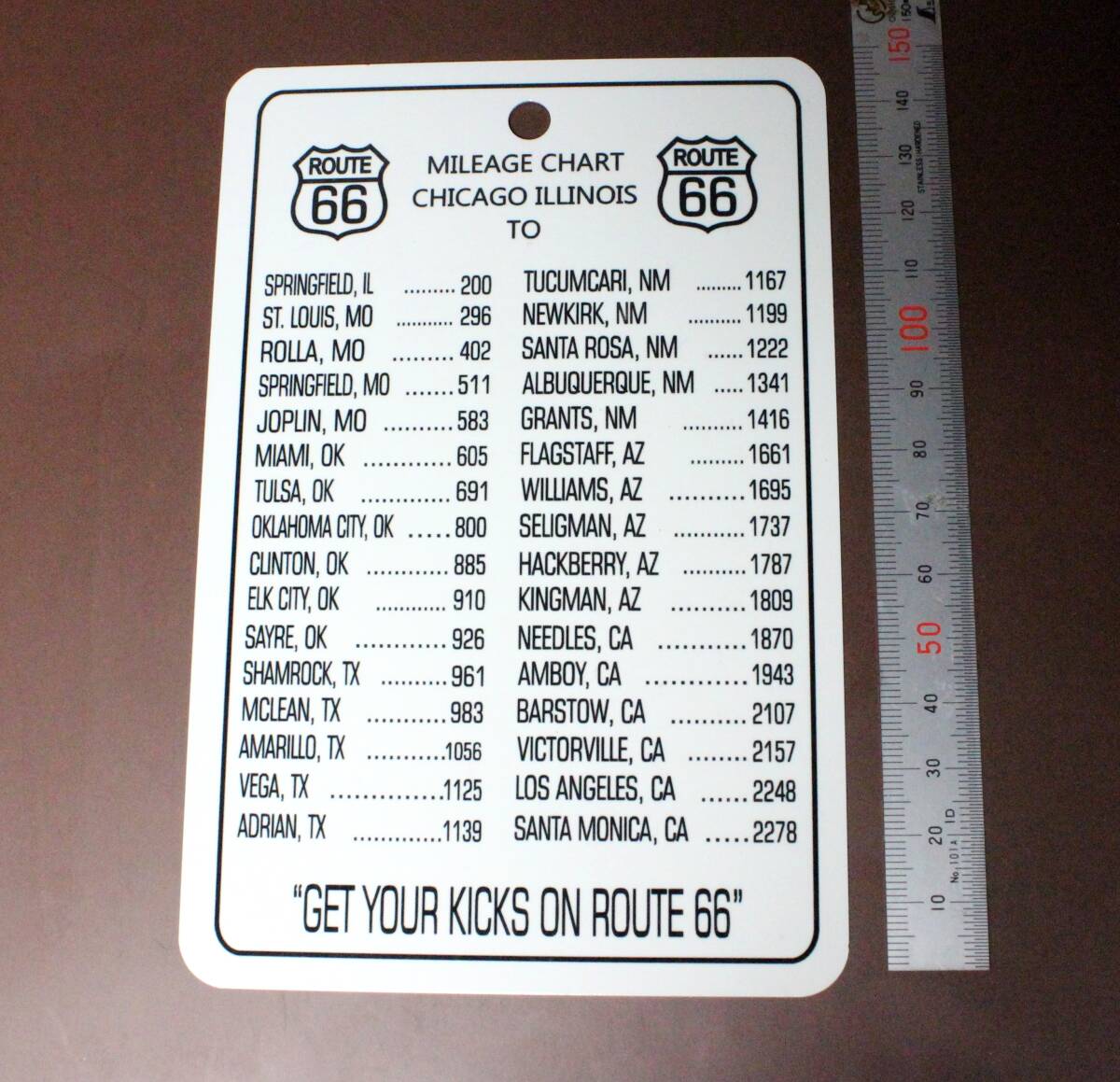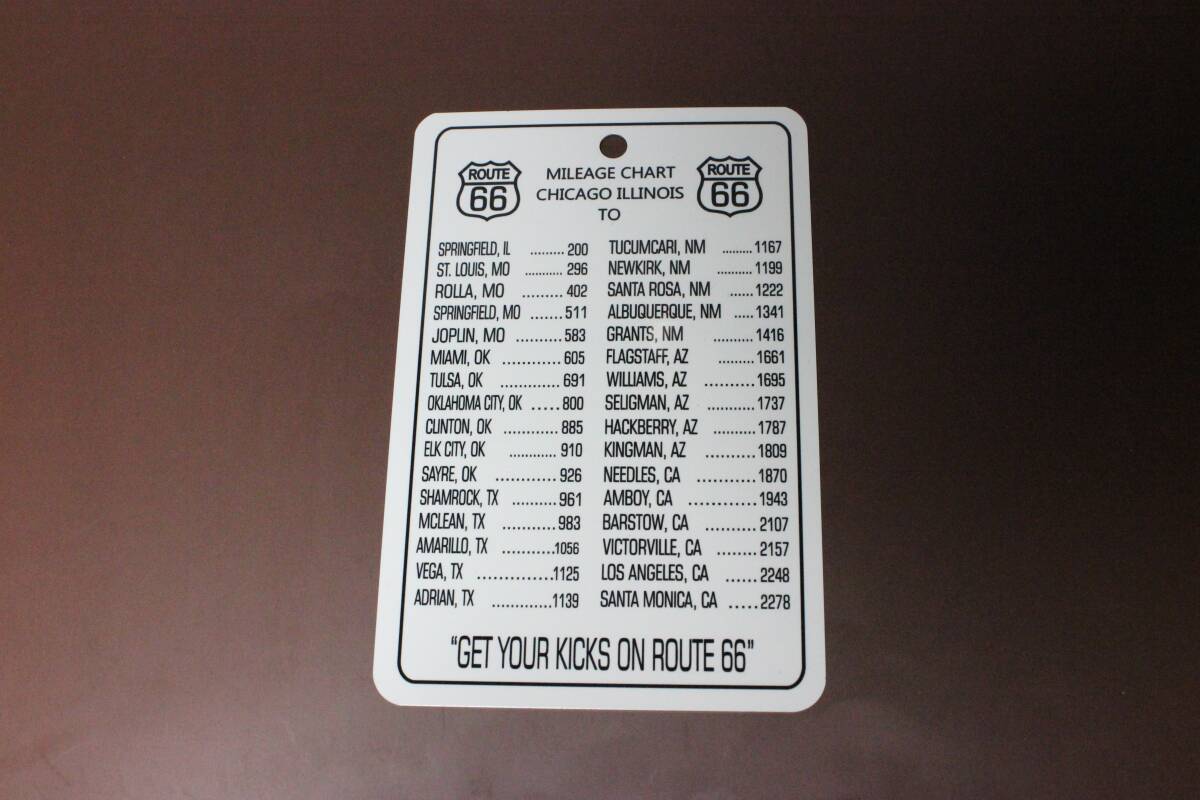 ルート66 "GET YOUR KICKS ON ROUTE 66" 主要都市距離一覧 ティンサイン ポストカードUSA直輸入。アメリカのマザーロード Route66のブリキプレート沿道の主な都市からイリノイ州シカゴまでの距離(マイル)が書かれています。はがき大のミニサイズなので、壁のちょっとしたスペースにさりげなく飾っていただけます。サイズ: 横 10.2 cm x 縦 15.3 cm x 厚さ 1 mm素材: アルミマウント用 穴 1カ所