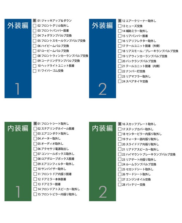 | 【車両DIY整備の内容をDVDにて収録】 ・書籍ではわかりづらい、商品の脱着方法などを動画で撮影 ・外装編、内装編の中に場所毎にメニュー選択で素早く見られます! ・商品を付けたいけど工賃高いし!と諦めていた方などこのDVDで工賃を浮かして下さい! | |||||||||||||