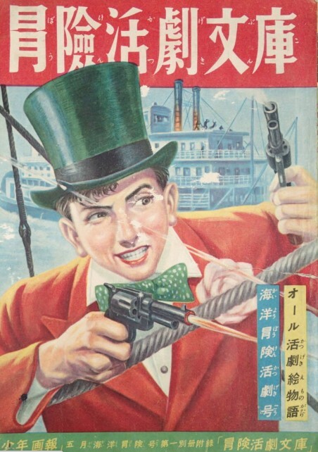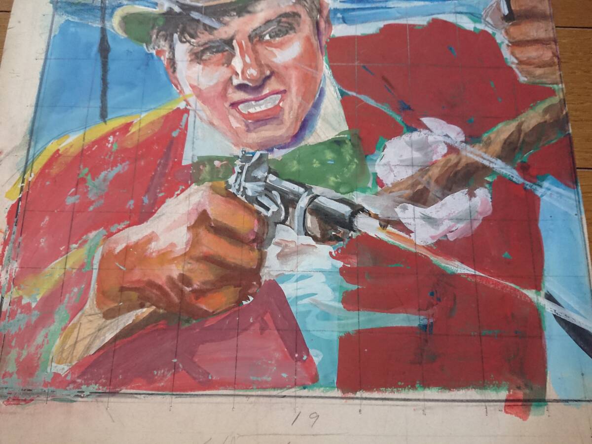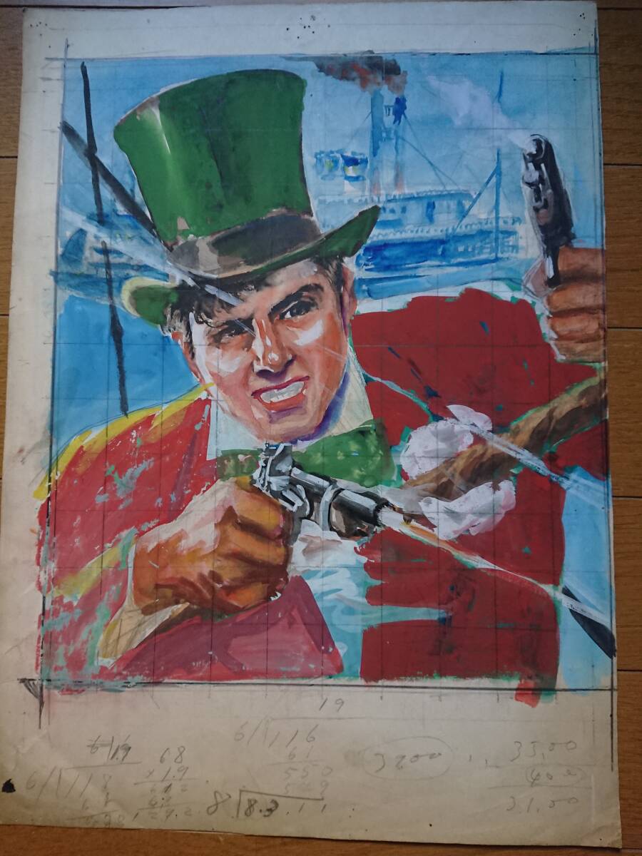 こちらは初期の「少年画報」シリーズの貴重な表紙絵の習作原画原稿「少年画報 冒険活劇文庫 別冊付録 昭和26年5月号」です。少年画報の初期表紙を多く描いていた岩井泰三先生によるもの。初期はほとんどを伊勢田邦彦先生、岩井泰三先生のお二人で書かれています。ともに挿絵画家、児童画家として知られています。
