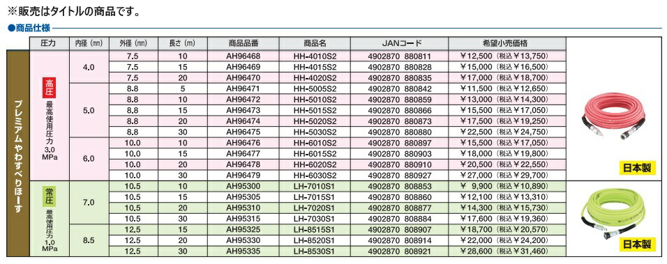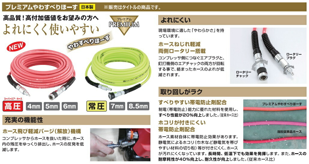 マックス MAX高品質!高付加価値をお望みの方へ…よれにくく使いやすい!高圧用エアホースプレミアムやわすべりほーす■仕様商品名:HH-5005S2商品品番:AH96471圧力:高圧(スーパーエア・ホース)最高使用圧力3.0MPa内径:5.0mm長さ:5m■充実の機能性・ホース飛び軽減パージ(解放)機構■よれにくい・ホースねじれ軽減・両側ロータリー搭載■取り回しがラク・すべりやすい帯電防止剤配合・ホコリが付きにくい・帯電防止剤配合