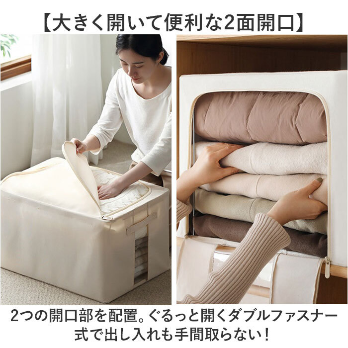 | 商品説明 | ・・【かさばりがちなアイテムの収納に】 ・すっきり整理整頓できて、すぐに取り出せる♪大容量の「折りたたみ式収納ボックス 」。 ・【たっぷり入って頼れる大容量サイズ】 ・マチと幅をしっかり設けた、容量約100L。厚手の衣類や寝具などの収納に最適。 ・【あれ?どこ行った?悩みを解消】 ・フタを開けなくても中身が確認できる、クリア窓付き。フロントと片サイドから中身を確認。 ・【大きく開いて便利な2面開口】 ・・2つの開口部を配置。ぐるっと開くダブルファスナー式で出し入れも手間取らない! ・【へたりにくくスタッキングも安心】 ・内側には折りたたみ式のフレーム。3辺を固定できて型崩れしにくく、積み重ねOK。 ・【持ち運びもスムーズな持ち手付き】 ・両サイドには、サッと持ち上げ可能な持ち手付き。本体は軽量なので、移動もラクラク。 ・【丈夫で衣類等にも優しい仕上がり】 ・本体は耐久性と耐摩耗性を持つ、綿麻混紡素材。通気性にも優れ、衛生的に保管。 ・【内側撥水でお手入れもカンタン】 ・内側に汚れなどを弾く撥水性を。お手入れも拭き取るだけで、ストレスフリー。 ・【使い方いろいろ◎マルチに活躍】 ・お子さまが遊ばなくなったおもちゃ、日用品などの収納にも。使い方は自分次第。 ・【押入れやクローゼットの片付けに】 ・衣類などをまとめたら、そのままクローゼットへ。衣替えもあっという間に完了。 ・【使わない時はスリムにまとまる】 ・嬉しい折りたたみ式ボックス。使わない時も収納場所に困らない! |