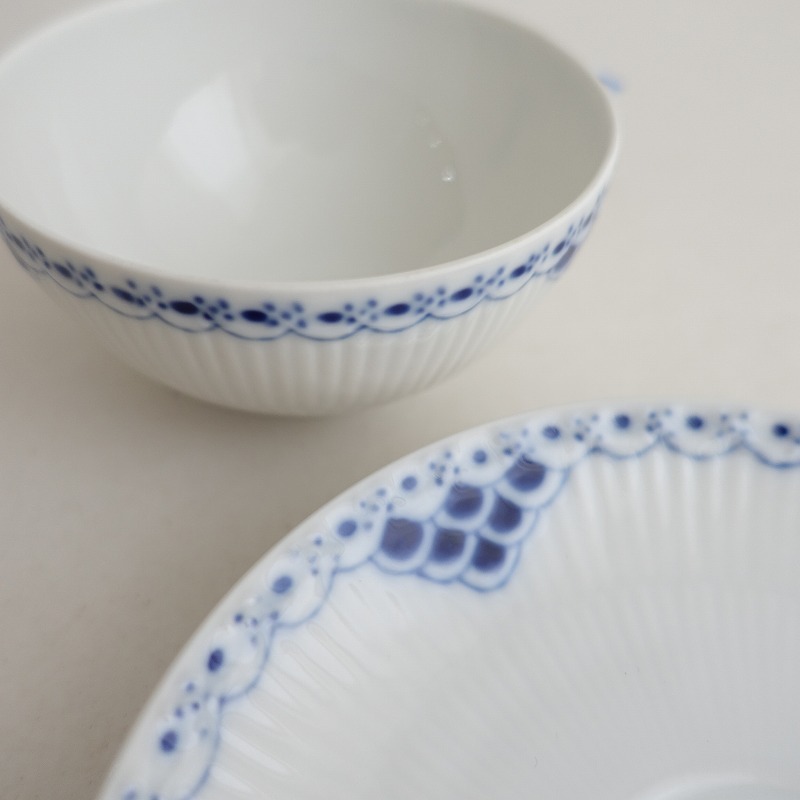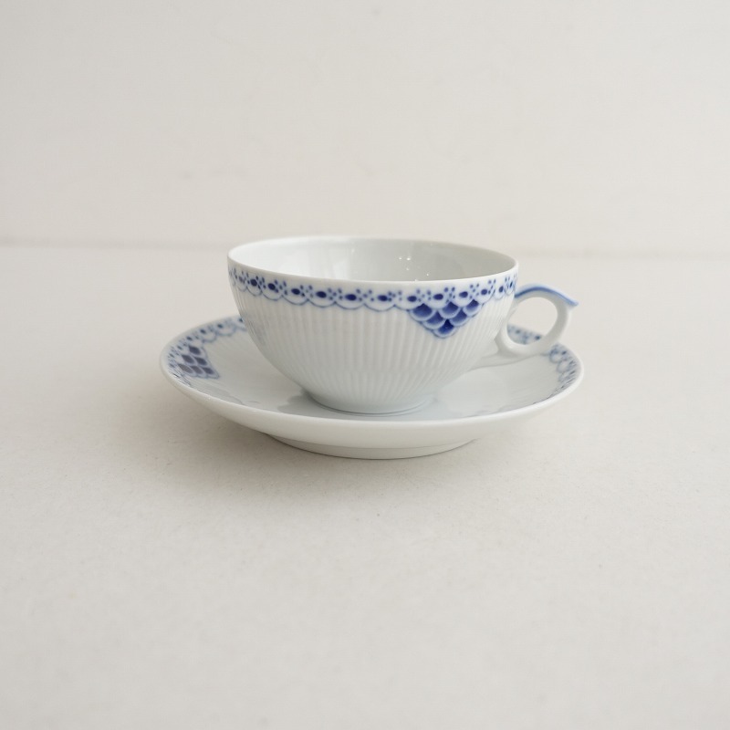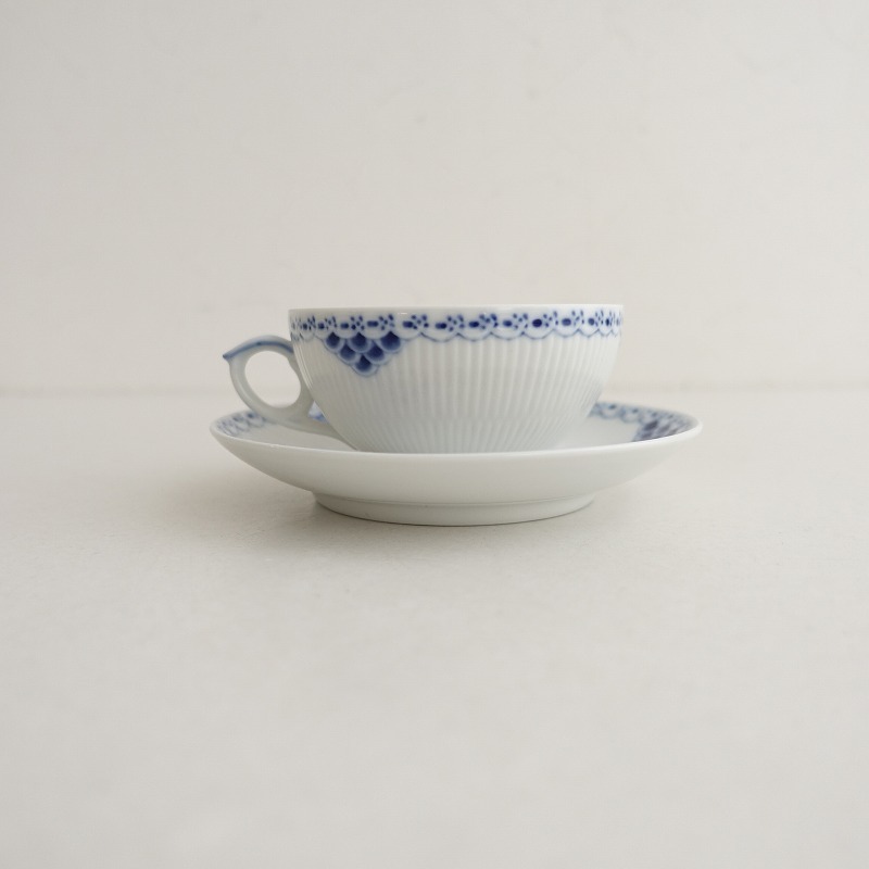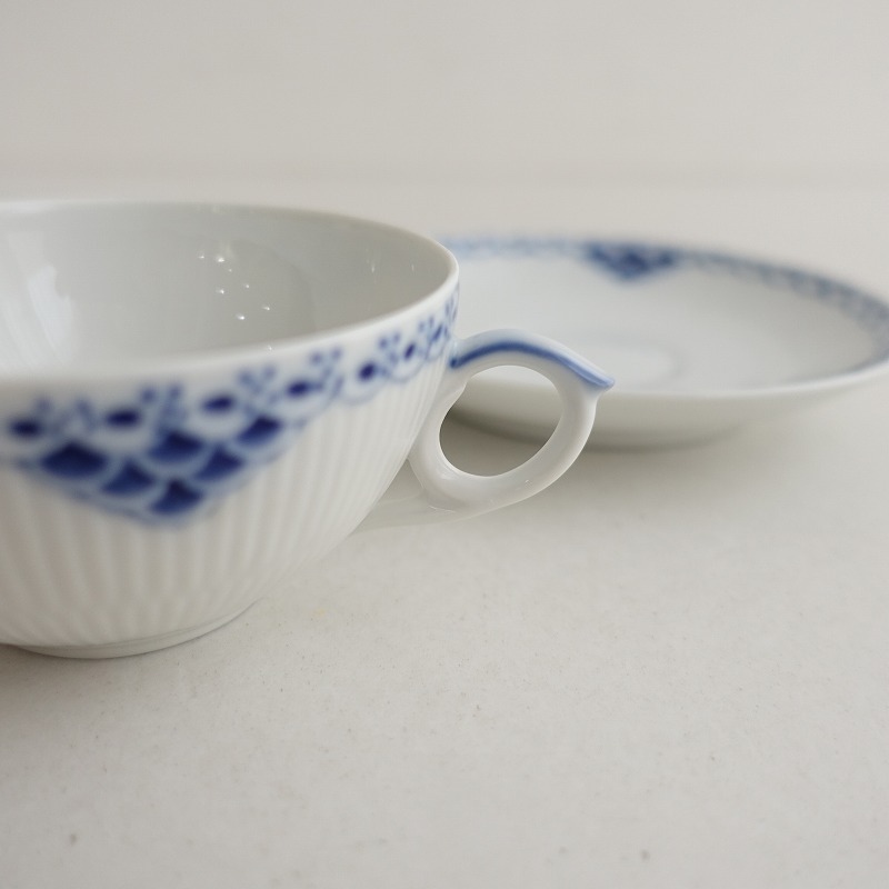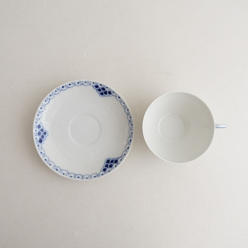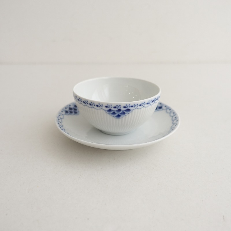 | ROYAL COPENHAGENのプリンセス ティーカップ&ソーサーです。 白地の器に描かれたブルーの繊細な模様が、華やかで上品な器です。 クラシックなフォルムが、ハンドペイントモチーフと美しく調和しています。定価(メーカー希望小売価格)は11,000円のお品物です。 |