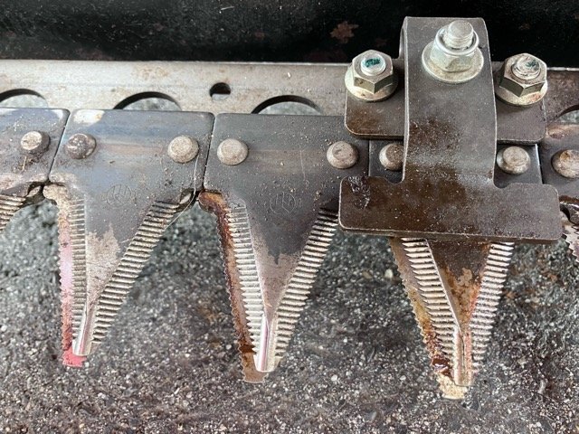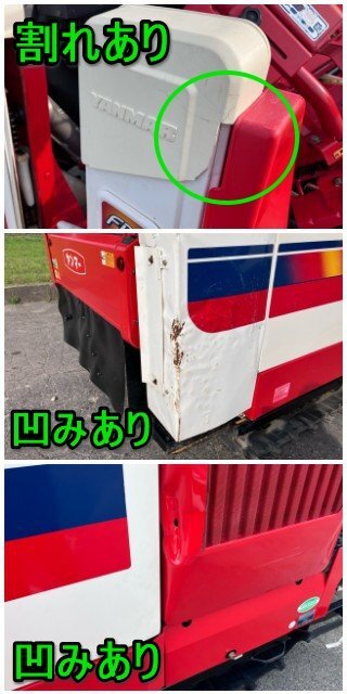 △右クローラーに約100㎜の切れが2ヶ所、左クローラーに約80㎜の切れが1ヶ所、両クローラーに約50㎜の切れが数ヶ所ずつ見受けられます。両クローラーに欠け、補修箇所が見受けられます。詳しくは写真にてご確認ください。
