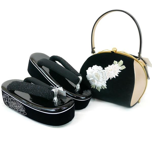 黒地に白糸でレースのお柄が織り込まれた、帯地を使用した草履バッグセット。