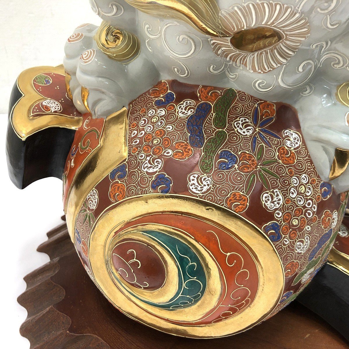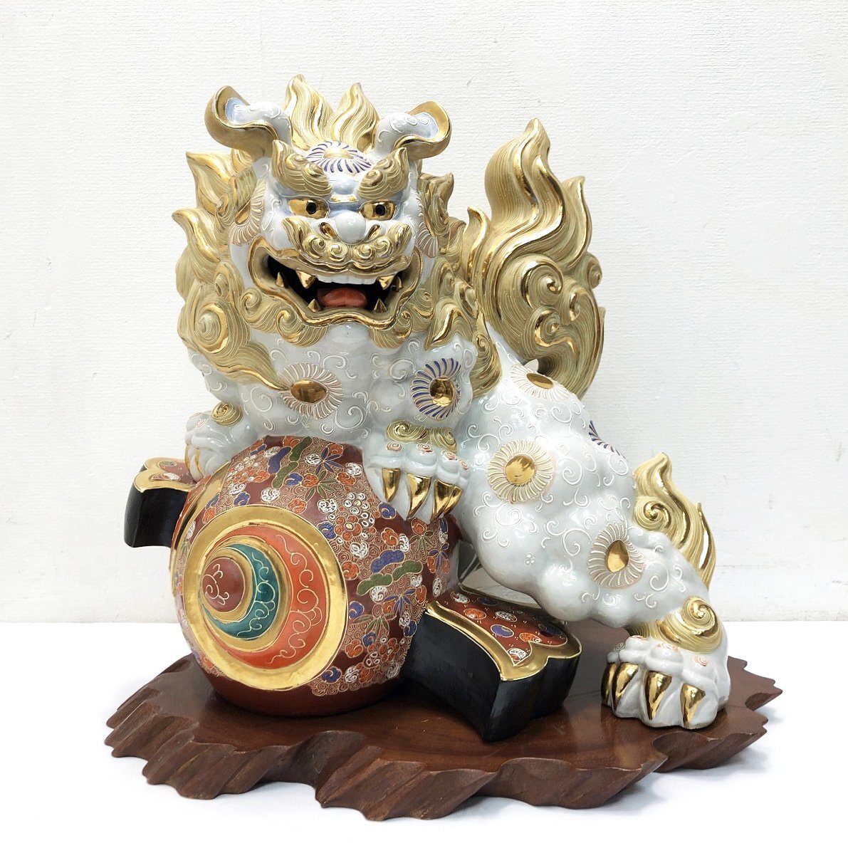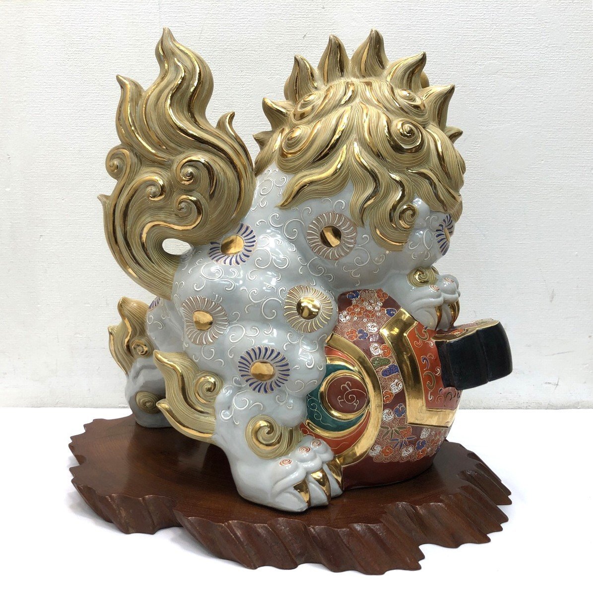 こちらは九谷焼 小槌獅子 縁起置物 魔除け 開運 白獅子 陶磁器です。 中古品です。 九谷焼特有の豪華な上絵付けが美しい小槌獅子の置物です。 獅子は古くから災いを退ける力があるとされ、打ち出の小槌は富を生み出す力を持つ縁起物です。 この二つが組み合わさることで、邪気を追い払い、富や幸運をもたらすとされています。 玄関や床の間に置くことで、邪気を払い良い気を取り込むと言われています。 この機会にぜひいかがでしょうか。 【コンディションについて】 多少の小傷があります。 詳細につきましては下記画像も併せてご参照ください。 ![]() 再良市場の他のお品物はこちらから!