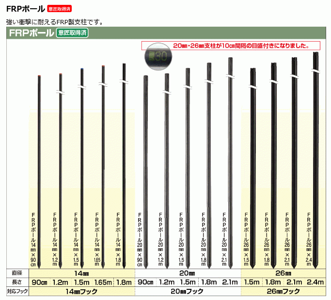 | FRP支柱に柵線を取付ける際は、各支柱の直径に合ったFRP用フックが必要となります。 ※Sガイシ等のガイシでは取付出来ませんのでお気を付け下さい。 |