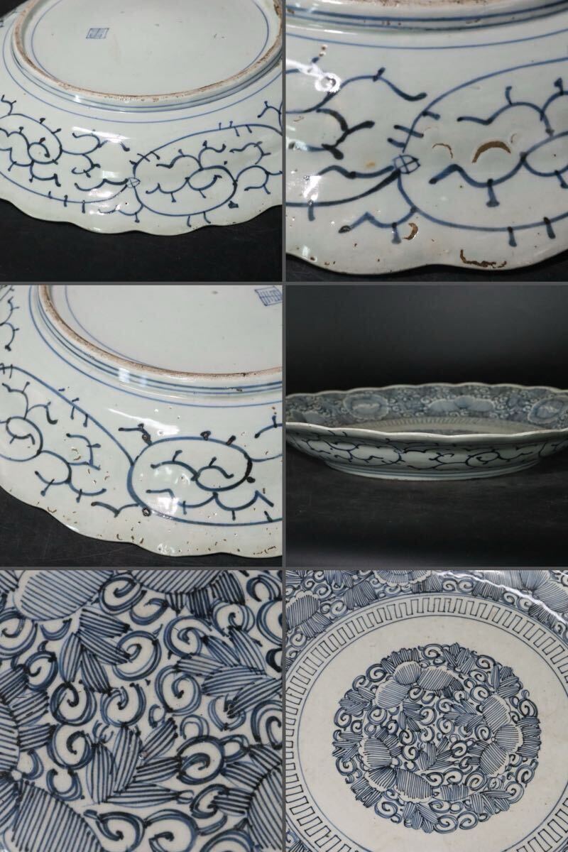 | 時代 在銘 線描 ・ 古伊万里 花図 芙蓉手 染付 大皿 / 有田 伊万里 煎茶道具 皿 .B1236 |