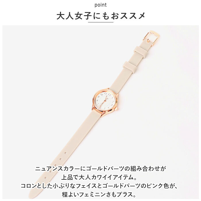 | 商品説明 | ・・付け心地抜群なウォッチ☆「ケルピー」が新発売♪ ・【シリコンバンド】 ・柔らかく馴染みやすいシリコン素材をバンドに採用!付け心地もいいのが嬉しいポイント♪ ・【大人女子にもおススメ】 ・ニュアンスカラーにゴールドパーツの組み合わせが上品で大人カワイイアイテム。 ・コロンとした小ぶりなフェイスとゴールドパーツのピンク色が、程よいフェミニンさもプラス。 ・【幅広いシーンで活躍】 ・コーデを選ばないデザインで普段使いはもちろん、オフィスやフォーマルシーンにも対応! ・【日本製ムーブメント】 ・静かに正確な時を刻む。確かな性能を誇る、安心と信頼の日本製高性能ムーブメントを採用。 ・【プチギフトにも最適】 ・幅広い年代の女性が着用できる上品なデザインで、お世話になった方やご友人へのプチギフトに最適。 |