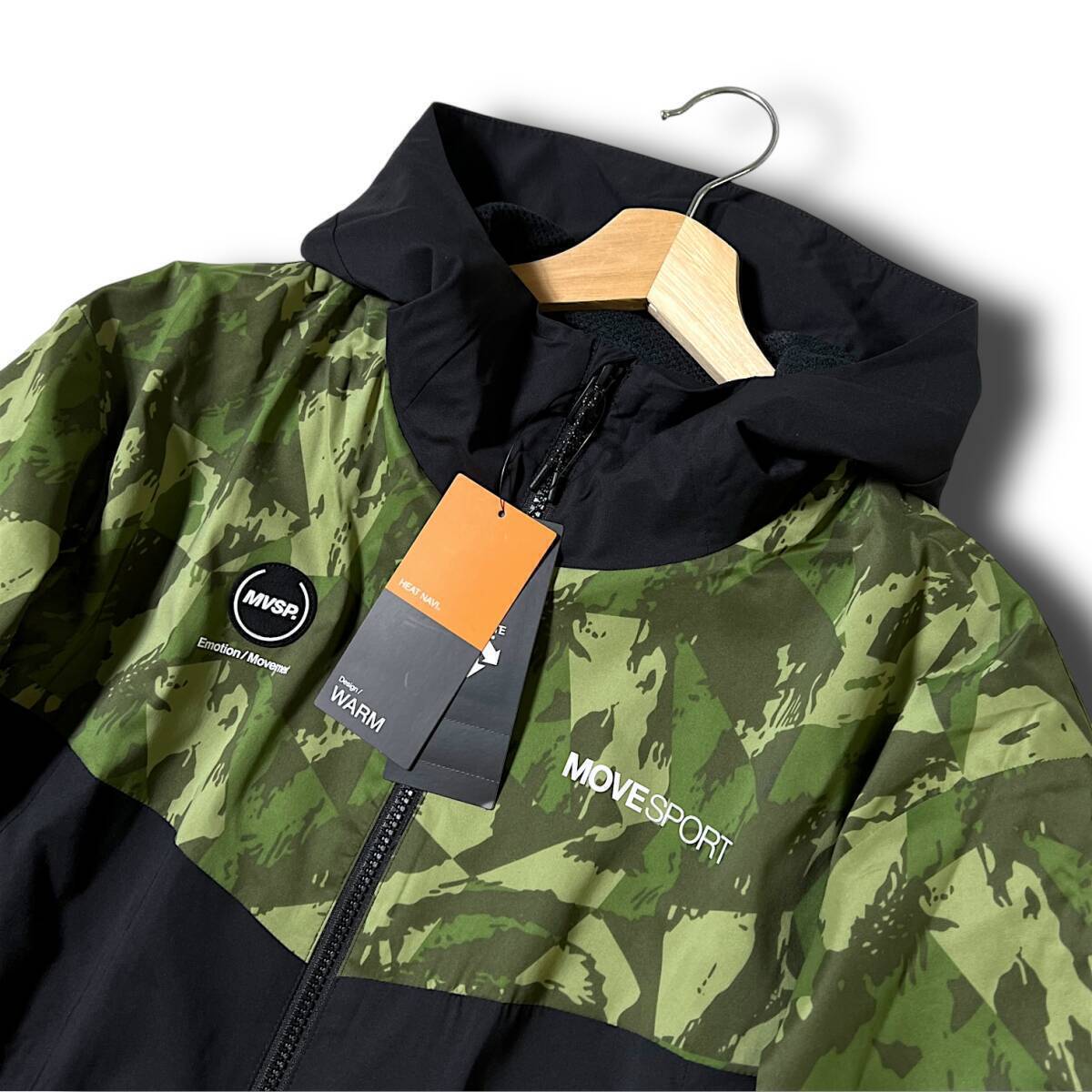 タイトル 新品 DESCENTE デサント MOVESPORT ムーブスポーツ MVSP 積極保温素材HEATNAVI 撥水 速乾 防風 保温 袖ビッグロゴ 裏地メッシュ 迷彩×無地 フルジップ シングルジップ フーデッド ジャケット パーカー フーディ L GOLF メンズ スポーツ レジャー 普段使い タウンユース グリーン×ブラック系 秋冬 AW FW 春も使える