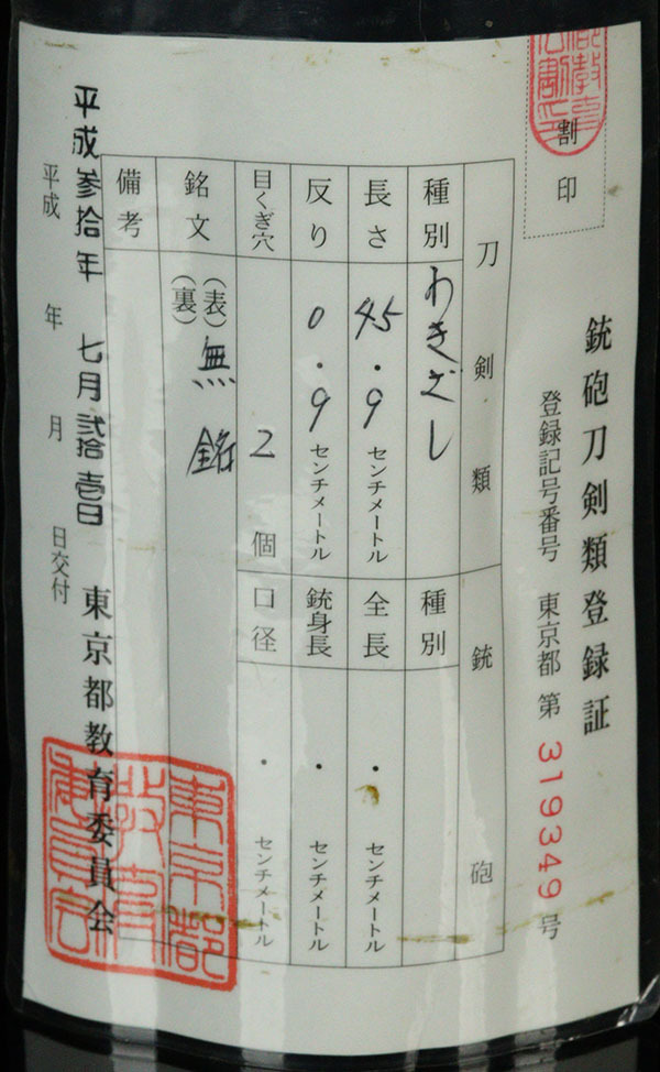 | ■刀剣のサイズ表示について 元幅・・・焼出し付近を測定しております 先幅・・・横手筋付近を測定しております 元重ね・・・焼出し付近の厚みを測定しております 先重ね・・・横手付近の厚みを測定しております (多少の誤差はご容赦ねがいます) ■銃砲類のサイズ表示について 全長・・・銃身先から台木尻までを測定しております 銃身・・・台木を除いて金属部分を測定しております (多少の誤差はご容赦ねがいます) 当社が出品する刀剣類は、入手した時の状態のまま出品しております。 ハバキ、小道具等も当社で調整したり付け替えたりはしておりませんので、合わせではないかというクレームは一切受け付けません。 刀身の疵も隠すことなく載せておりますので写真をよくご覧になってご入札ください。 疵に関して、説明がない等のクレームは一切受け付けません。 写真ではわかりにくい部分は質問欄やお電話でお問い合わせください。 但し、説明欄に表記のない刃切れに関してのみ返品やご相談に応じます。 ※ご落札しご購入されお手元に届いてから20日以内に 登録証に記載されている各都道府県の教育委員会にご連絡し 登録証の所有者変更を必ず行ってください | |||