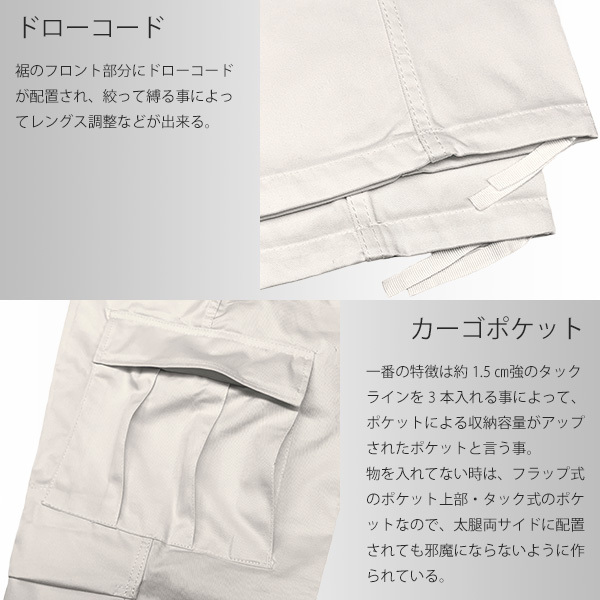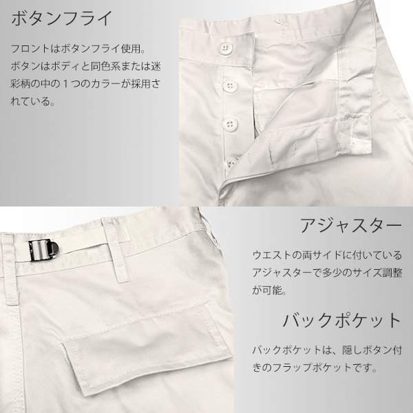 | USミリタリーブランドの老舗ROTHCO社の6ポケットカーゴパンツです。普通のチノパンと同じくらいの厚さのツイル生地(チノ生地)のボディで、ヒップと膝にパッチが付いたオーソドックスなカーゴです。レングスはドローコードを絞ってスソをたるませることによって、多少調整して履くこともできます。フロントはボタンフライ(ボタン開閉)です。シルエットはチノパンに近い感じになり、履き心地も良くお勧めの商品です。リーズナブルなプライスですので、リメイクやチームユニなどにもお勧めの1本です。他のカラー、サイズも出品中です。 MADE IN CHINA ■ブランド: ROTHCO ■商品名: ULTRA FORCE B.D.U.'S PORY/COTTON TWILL ■カラー: オフホワイト ■素材: ポリコットン混紡のツイル地 ■サイズ表(cm): 《Lサイズ》 表記サイズ:ウエスト35-39インチ、ヒップ52インチ 実寸サイズ:ウエスト102,レングス82,わたり幅37,すそ幅22.5,股上33 ※サイズ誤差の大きいブランドですので、上記の数値は参考程度にお考えください。 ■仕入元: ROTHCO(正規店) ■状態: 新品未使用(タグ付き) |