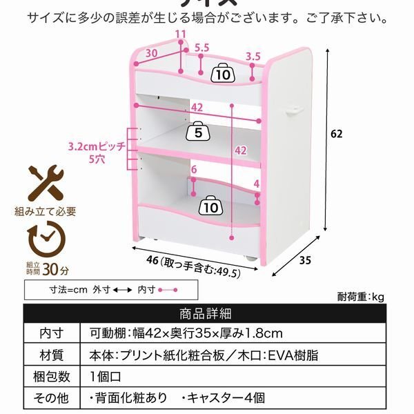 | 【カラー】 ホワイト×ブラウン、ホワイト×ピンク 【サイズ】 <外寸> 幅46(取っ手含む:49.5)×奥行35×高さ62cm <内寸> チェスト天板:幅42×奥行30×高さ3.5~11cm オープン部:幅42×奥行30×高さ42cm 可動棚:幅42×奥行35×厚み1.8cm(3.2cmピッチ5穴) 【材質】 本体:プリント紙化粧合板 木口:EVA樹脂 【耐荷重】 天板:(約)10kg以下 可動棚:(約)5kg以下 固定棚:(約)10kg以下 【生産国】 中国 【梱包】 サイズ:66.5×38×12.6cm、重量:10.2kg 【その他】 ・背面化粧あり ・キャスター4個 【組み立て品】 お客様による組み立てが必要です。 【ご注意】 ・サイズ、重量は概算です。 ・商品カラーはご使用のモニターによって実際の明るさや色と異なって見える場合がございます。 |