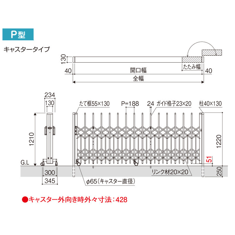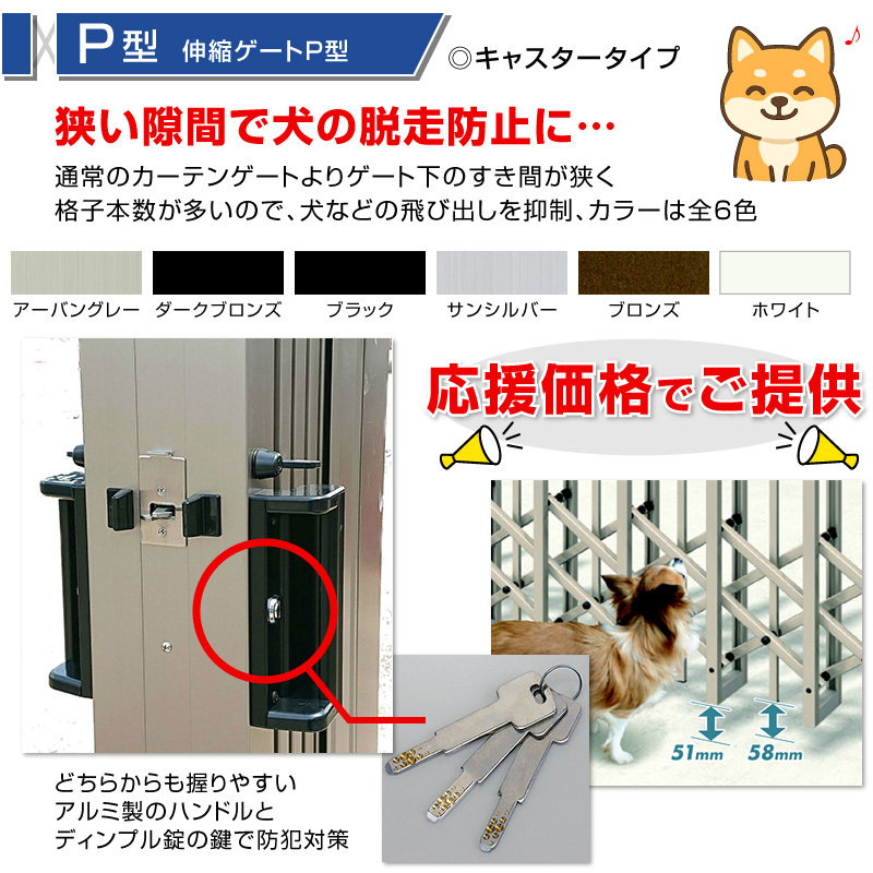 | 商品詳細 | この度は数ある商品の中から当商品を閲覧頂きまして有難う御座います。 商品定価 339,020円 ⇒ 販売価格 151,250円(送料・税込み) ●通常のカーテンゲートよりもゲートの下の隙間が狭く格子本数が多いので、 ペットの飛び出しを抑制します。 駐車場やお庭でも安心してペットを遊ばせることができます。 ●アコーディオン部分の下部は、下部キャップ付きでペットに優しい設計。 ●ダブルキャスターが標準装備。高さ調整式で水勾配に対応します。 ●ピッキングやキーを複製されにくいディンプルキーを採用。 ●立ったまま手元で落とし棒が操作可能なステンレス製落とし棒。 太さΦ14mmで本体の揺れを軽減します。 ●伸縮部分は180°回転収納可能。スペースを有効に利用する事ができます。 ●全幅調整用ストッパー付きでゲート本体の幅を若干伸ばせます。 ●設置時に右開き・左開きどちらにも設置可能です。 ●安心の国内メーカー製。 商品名:伸縮門扉 ペットガード 片開きタイプ ダブルキャスター式 サイズ:全幅:3373mm 開口幅:3293mm たたみ幅:525.5mm 高さ:1210mm カラー:アーバングレー/ダークブロンズ/ブラック/サンシルバー/ブロンズ/ホワイト 仕 様:柱埋め込み式 錠有り 耐風圧:風速34m/s相当 材 質:アルミ形材 オプション:ベースプレート式に変更・後付けガイドレールタイプに変更・ 転倒防止金具(ガイドレールタイプには取付不可) |