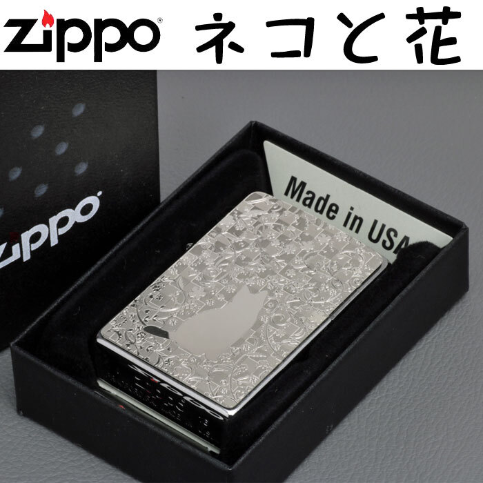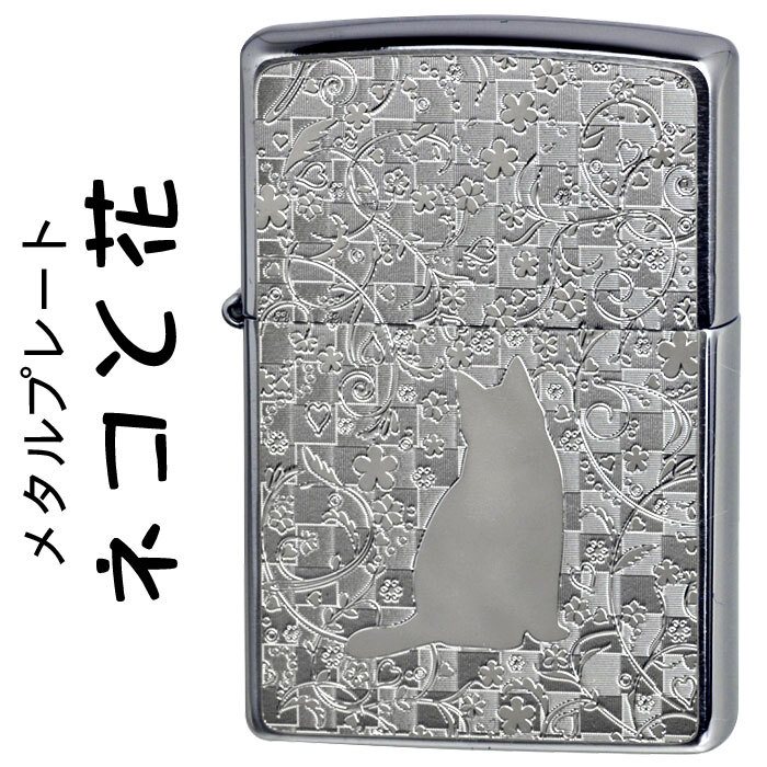 【ZIPPO】ジッポ zippo(ジッポーライター猫) ネコと花 ブラッシュクローム メタルプレート貼り