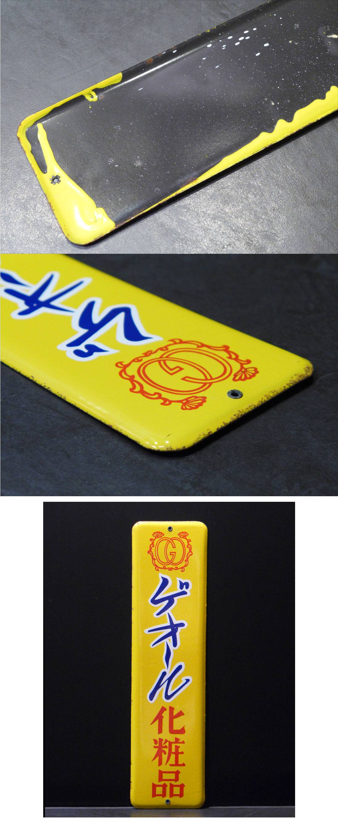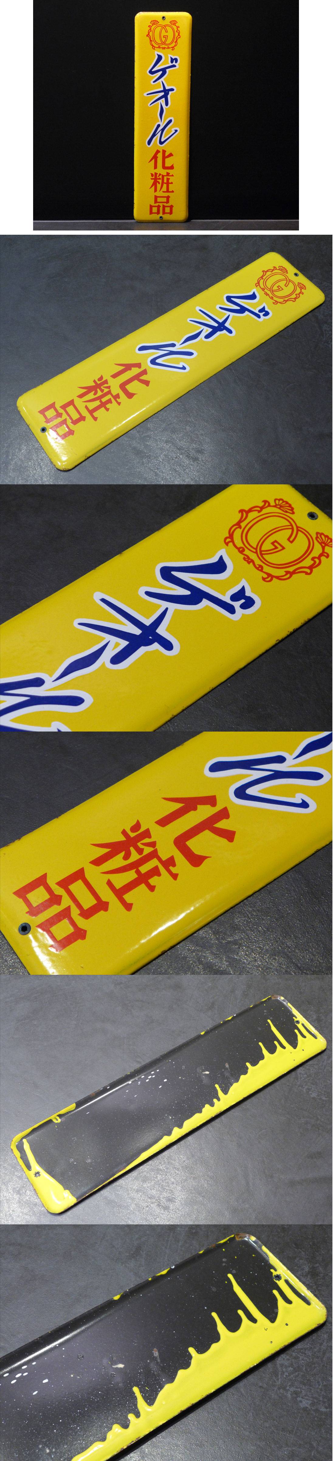 当時物 稀少 昭和レトロ ホーロー看板 『ゲオール化粧品』、約45x12cm。錆等の経年感有り。状態は画像参照でお願い致します。 経年保存品の為、画像をよく見て頂き、状態に了承いただいた方のみの御入札をお願い致します。