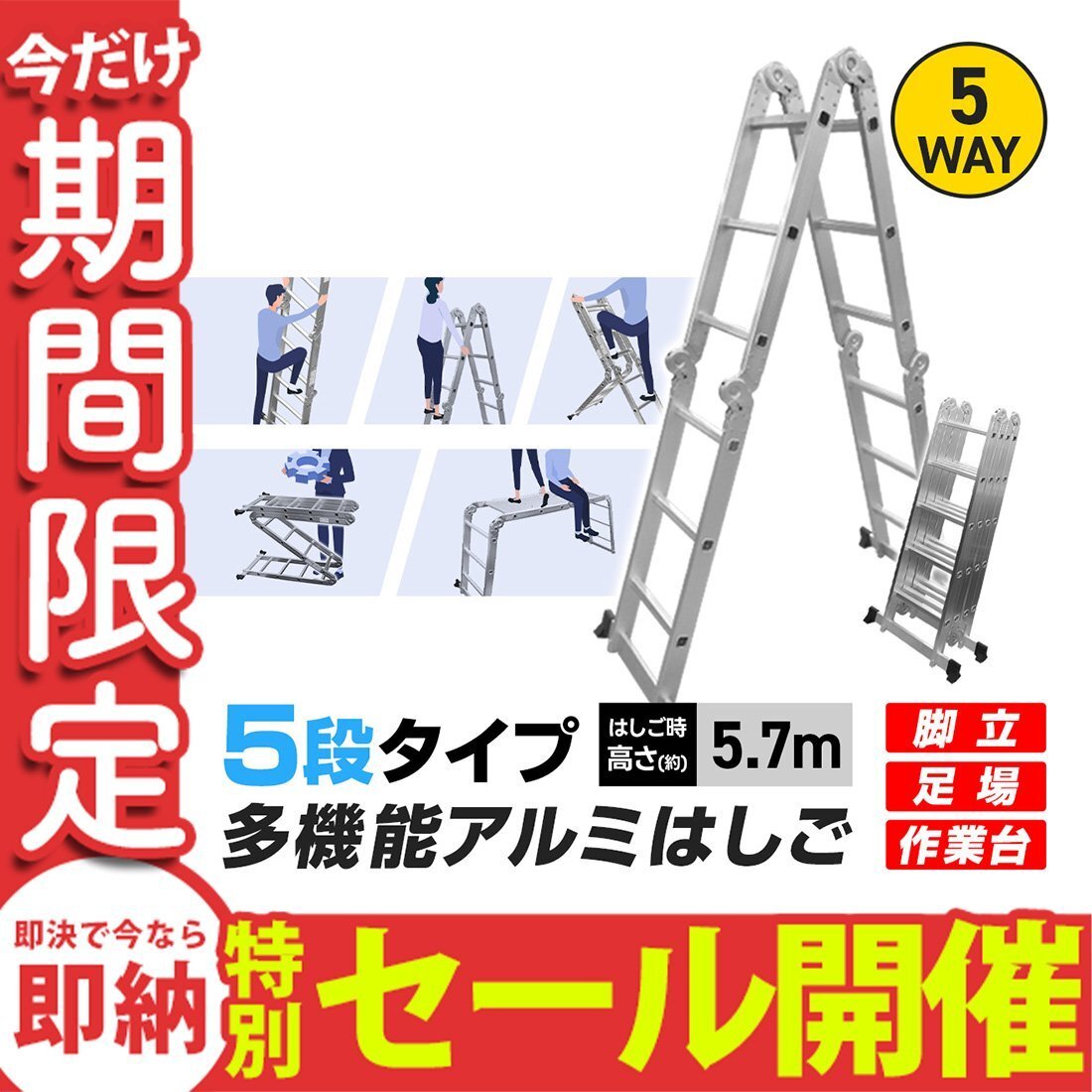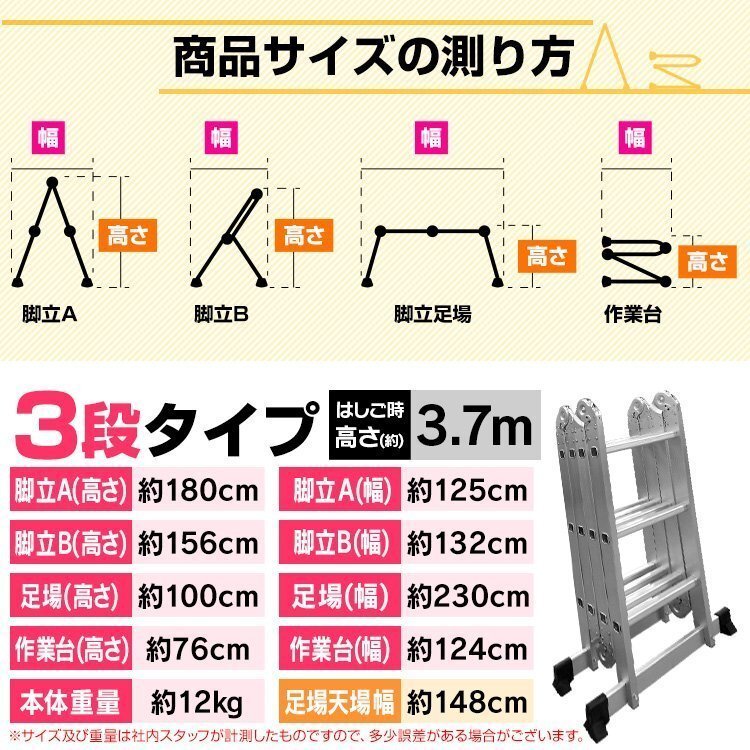 | 折りたたみ式多機能アルミはしごです。 はしごとして、脚立として、そして作業時の足場としても利用できるマルチなハシゴです。 大掃除に雪下ろし、ガーデニングや洗車にも! 一家に一台あると便利なはしごです。 ◎はしごとして 雪下ろしに!高所作業に! 3段タイプは約3.7m、4段タイプは約4.7m、 5段タイプなら約5.8mの高さまで伸びます! ◎足場として はしごを壁に立てかけられない時は、断然足場スタイル。 洗車時、長時間の高所作業にもおすすめです! 作業台にもなります。 ◎脚立として 脚立としてご利用いただく場合は2パターンの設置方法が可能。 ◎作業台として 3段・4段タイプだと、台を置けばちょうど良い高さの作業台になります。 ◆便利・安心のワンタッチロック機構 ワンタッチ式ロック解除レバーを採用。レバーを解除して変形させると、一定の位置で自動的にカチッとロックがかかります。 ◆安定感抜群のスタンド付 底部には地面をしっかり捉える、横倒れ防止用の足がついていますので、安全に作業が行えます。 |