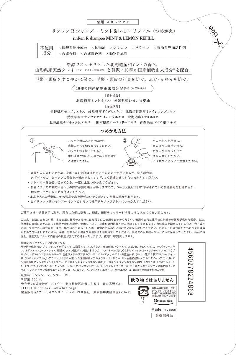 商品名:リンレン シャンプー 凛恋 レメディアル ミント&レモン 300ml 詰め替え リフィル 無添加 ノンシリコン rinRen 2袋セット植物のチカラ』をいかした薬用ヘアケアで、頭皮環境を健やかに! 毛根の毛穴に詰まった汚れや皮脂をクレイが吸着し、きれいに落とします。「リンレンレメディアル ミント&レモン」は、従来の薬用ヘアケアの概念とは異なる、『植物のチカラ』をいかしたスカルプラインです。育毛、発毛にとって『頭皮を清潔に保つこと』『血行の促進』が重要なポイント。頭皮改善に適した「甘草(グリチルリチン酸ジカリウム)」「ドクダミ」「ミツイシ昆布」などを配合しました。また、国産クレイ(山形県産ベントナイト)を配合し、毛穴の汚れを落としながら、有効成分を毛穴の奥まで届けます。<こんな方へおすすめ>■事前ケアをしたい方■髪の毛が細くなった方■産後脱毛でお悩みの方■フケ・カユミが気になる方<FRAGRANCE>天然の香り(精油)「北海道産の和ミント」や「愛媛県産のレモン」の冷涼でフレッシュな香りをお楽しみいただけます。