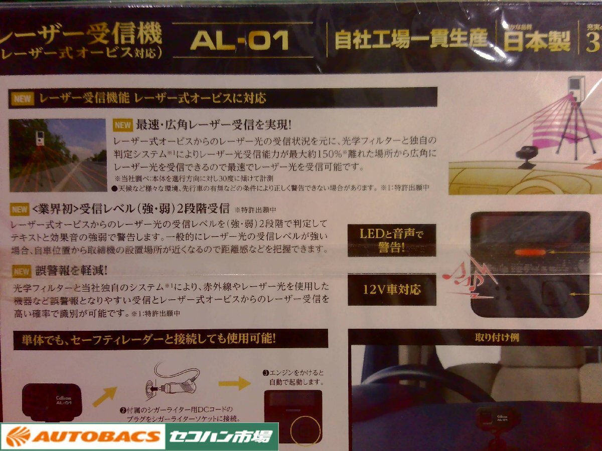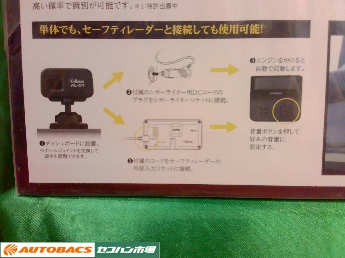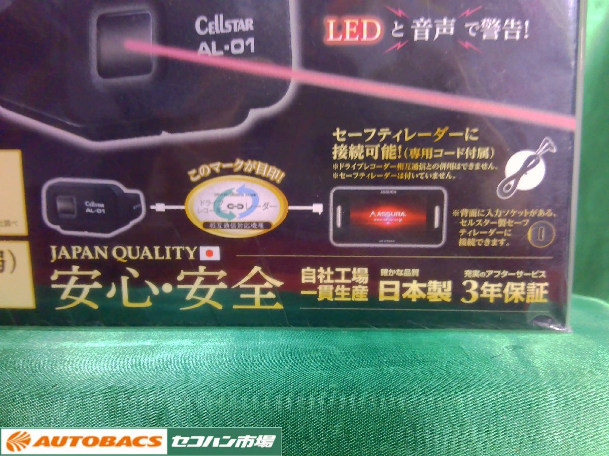 | 商品説明 | ●セルスターレーザー受信機【AL-01】未開封未使用品! ※セルスターレーダーと接続可能! ※単体使用もOK(警告音とLEDのみ) 【商品名】:セルスターレーザー受信機AL-01 ・レーザー取締機受信機 ・LEDランプ及び警報音スピーカー ・セルスター製セーフティーレーダー接続可(端子による) ・DC12V専用 ・シリアル:39K98517 【状態】 未開封の未使用品です。 【付属品】 本体(レーザー受光部)、スタンド、DCコード(シガー)、レーダー接続コード、両面テープ、取扱説明書 【保証】 商品の不良に関しましては、当店の保証規定に基づき対応させていただきます ※商品到着後”1週間以内”の返金保証となります ※”返金保証”につきましては”落札金額”のみの保証です、その他取付等に伴う”部品代”や”作業工賃”等の保証は一切ありません ※修理保証も一切ありません ※適合不可やお客様都合の場合は返品等の対応は致しません |