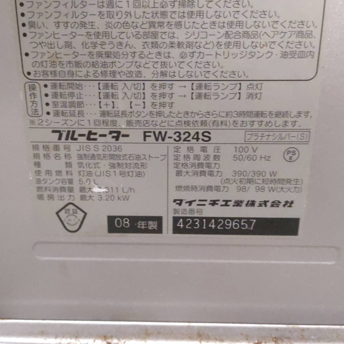 F2エラー 石油 ファンヒーター メーカー:DAINICHI 型番:FW-324S 製造年:2008年製 適用床面積:木造9畳/コンクリ12畳 タンク容量:5L 部品のみ(基板やモニター、タンク等)のお取引も可能です。 | |