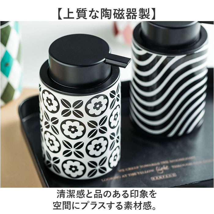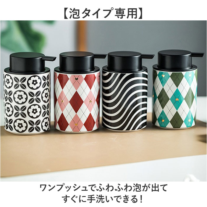 | 商品説明 | ・・【選べるデザイン】 ・好きなテイストを選んで毎日の手洗いタイムを楽しく♪ ・【上質な陶磁器製】 ・清潔感と品のある印象を空間にプラスする素材感。 ・【大きめプッシュ】 ・ブラックのワイドプッシュが押しやすく使い勝手抜群◎ ・【泡タイプ専用】 ・ワンプッシュでふわふわ泡が出てすぐに手洗いできる! ・【たっぷりサイズ】 ・350ml入るので詰め替え回数を減らせて便利○ |