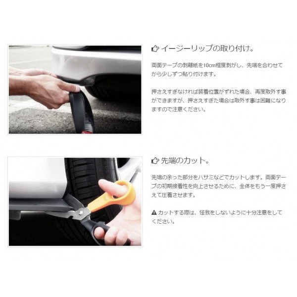 エニーズ【イージーリップ】ブラック EZ1001 ■バンパーやスポイラーなどに両面テープで取り付ける、 汎用リップスポイラー ■柔らかいフォームラバー製で、車高ダウンのドレスアップ効果と 同時にバンパーやスポイラーを保護するプロテクターとして機能。 ■取り付けは、裏面の3M両面テープで直接貼り付けます。 ■製品サイズ:長さ 259 cm |