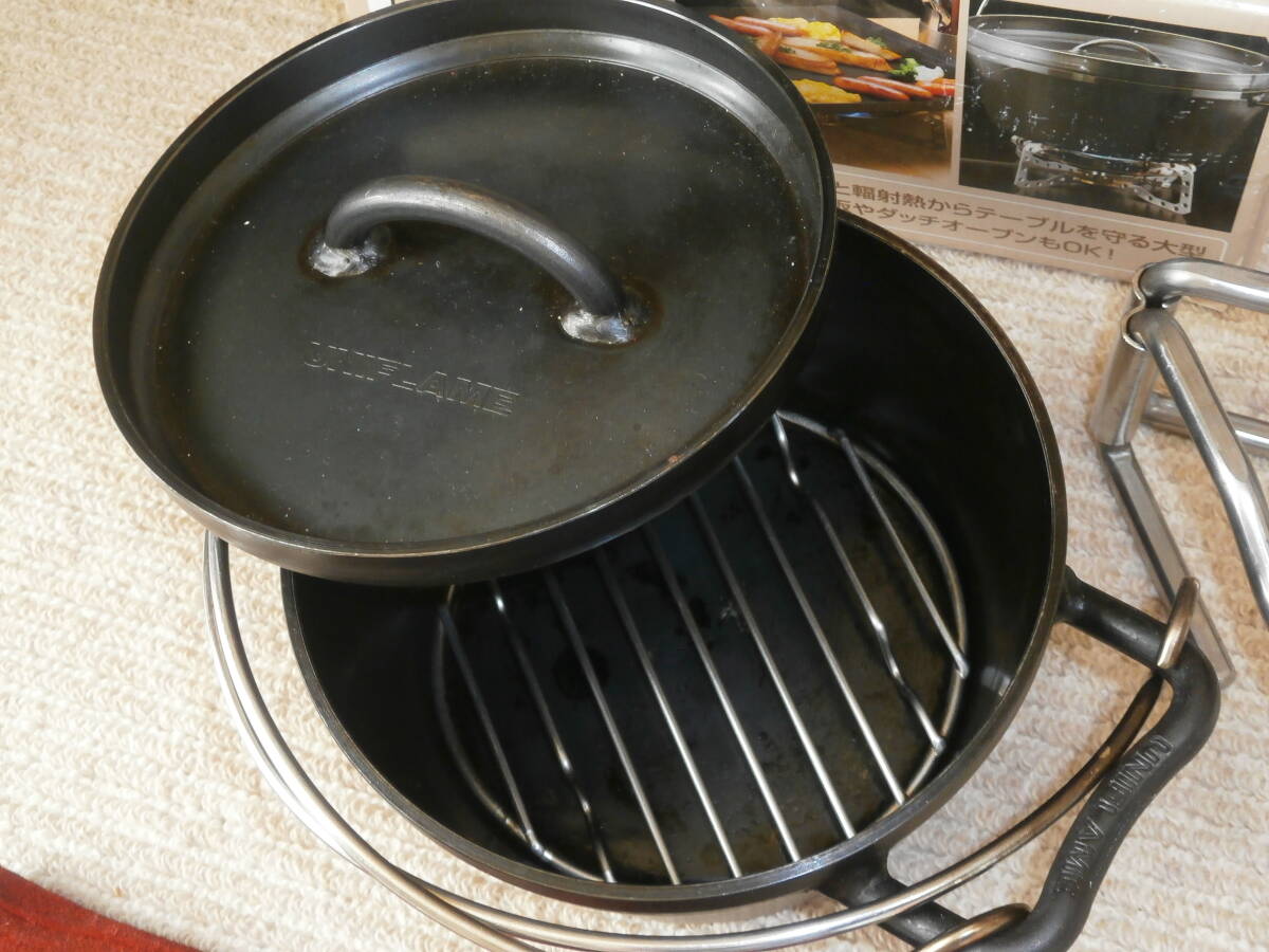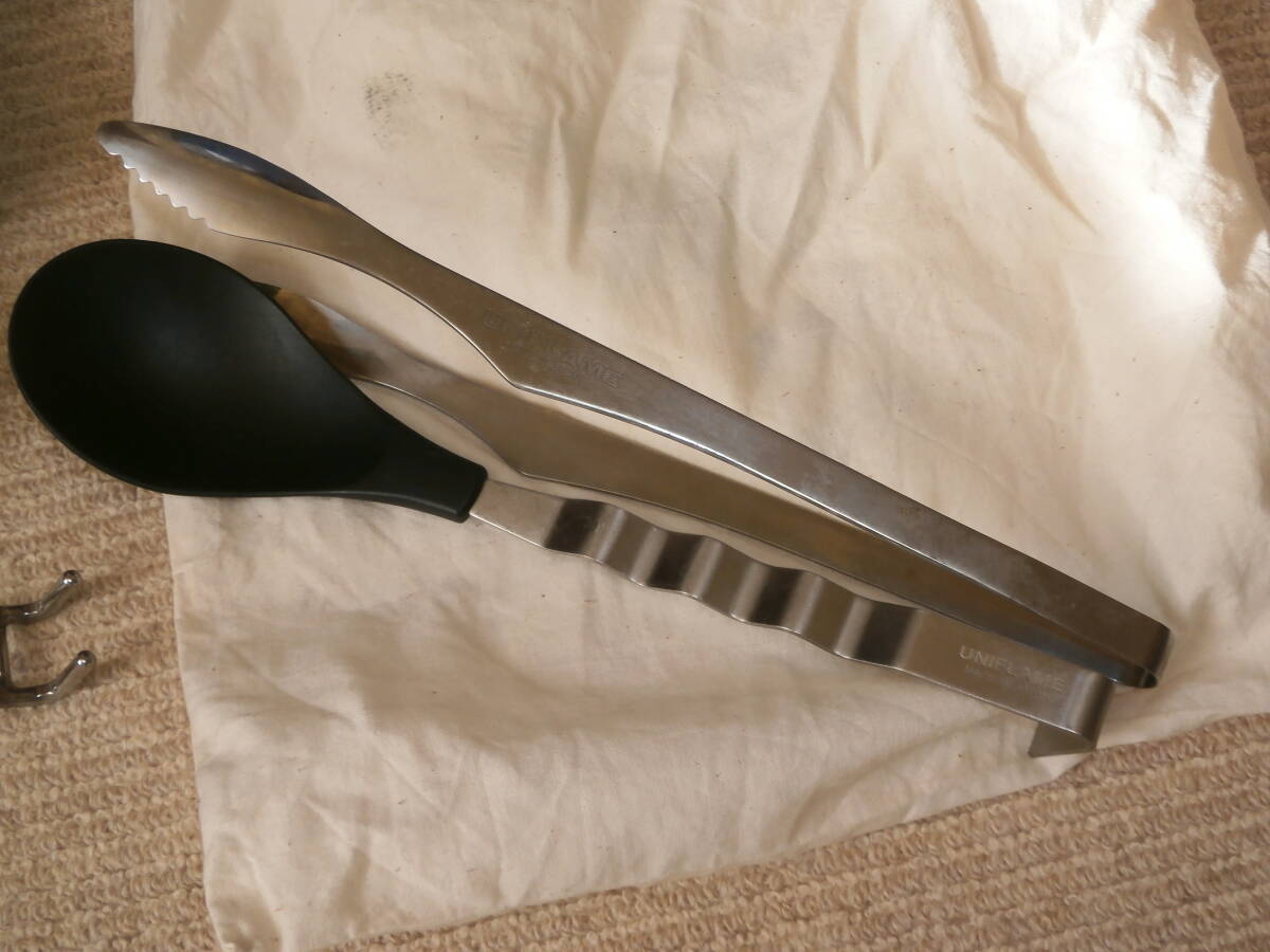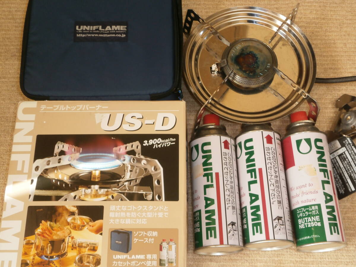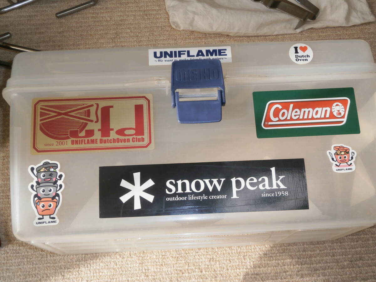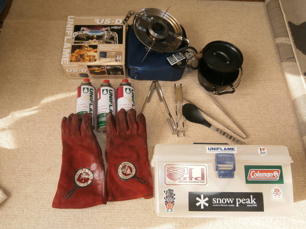 UNIFLAME UFダッチオーブン 6インチ <箱なし・ケースなし>、テーブルトップバーナーUS-D、ガス3本<保管していましたが未使用です>、LODGEグローブ<汚れあり>、ボックス<入れて保管してました>、置台、バーベキューの網つかみ、アルミトング、しゃもじなど使用品