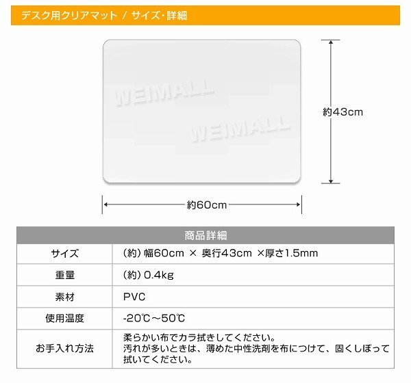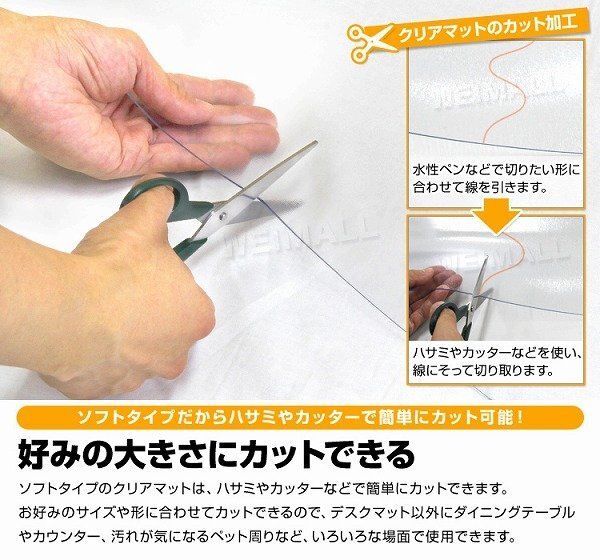 | カレンダーや予定表、メモなど挟めるクリアタイプのデスクマットです。 光学式マウスにも対応しているので、マウスパッドを使用せずにマウス操作ができます。 デスクマット表面にエンボス処理を施すことで、ベタつきを感じさせないサラっとした表面になっています。 また、このエンボス処理は光の反射を抑えてくれる効果も◎! ハサミで簡単にカットができるので、デスクマット以外にも、様々なシーンで使用できます! 【商品仕様】 カラー:クリア サイズ(約):幅60cm×奥行43cm(厚さ1.5mm) 材質:軟質PVC 使用温度(約):−20℃〜50℃ ※お手入れは薄めた中性洗剤を湿らした布につけ、固く絞って拭いた後、水分が残らないように乾いた布で乾拭きしてください。 ※日の当たる所で使用しないでください。日焼けで硬化する場合があります。 |