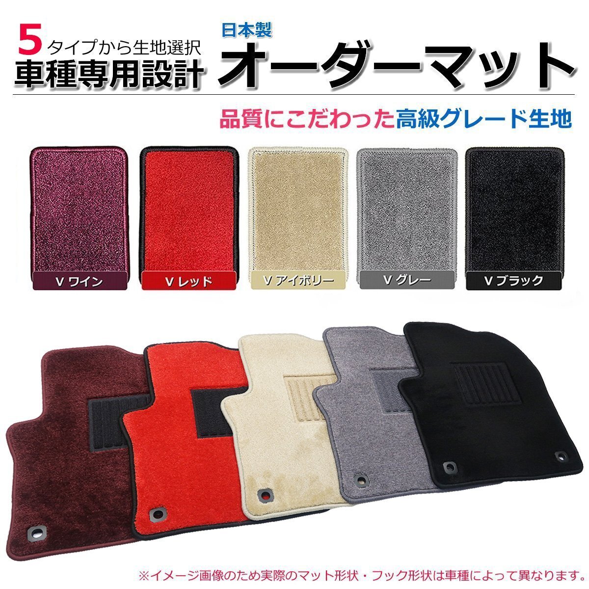 | 【生地選択】 | ■ ご希望の生地を5タイプよりご選択ください。 ・ ブラック / グレー / アイボリー / レッド / ワイン ※基本的に運転席マットはヒールパッド【付き】となりますが【なし】での製作も可能です。 【なし】をご希望の場合はお申し付けください。 |