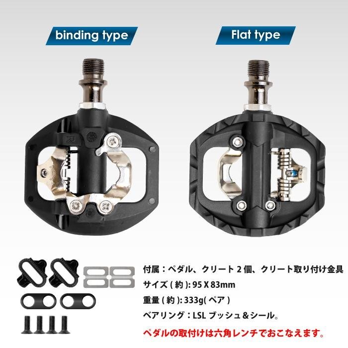 | ロードバイクやクロスバイク、MTBに最適なマルチペダル。 SHIMANO SPDに対応 片面フラット 片面ビンディングペダル ペダル本体の調整ネジを調整することで、クリートを固定する強さを設定できます。 片側がフラットなので、通勤時や街乗りのスニーカーや、ちょっとそこまで行くのに便利です。 ・ビンディング面は固定調整付きで脱着の強さ調整ができます。 ・六角レンチペダル交換タイプです。 ・(おすすめ)ペダルの交換時にグリスを塗ると固着を防止するのでグリスは塗っておく事をおすすめします。 サイズ(約): 95 X 83mm 重量(約): 333g(ペア) ※ジャンク品のためキズ、汚れ等ある場合がございます。付属品が足りない、正常に動作しない、修理が必要な場合がございます。ノークレーム、ノーリータン 《ご注意》 ・ディスプレイ環境により実物と色が異なる場合が有ります。 ・入荷時期により予告無く一部仕様変更する場合が有ります。 | |