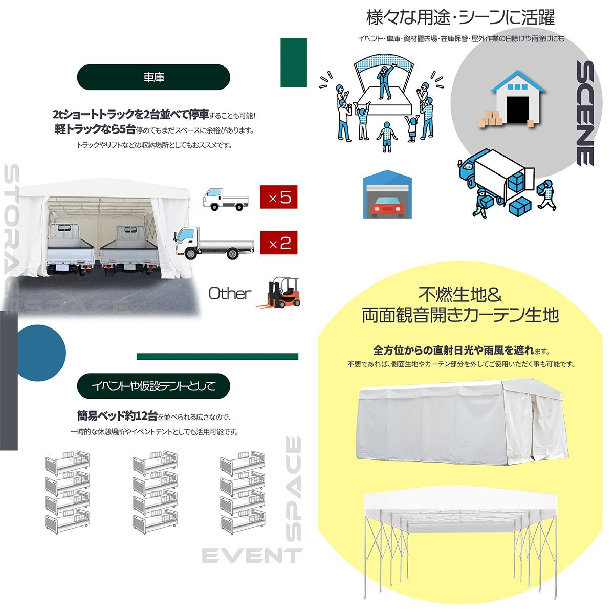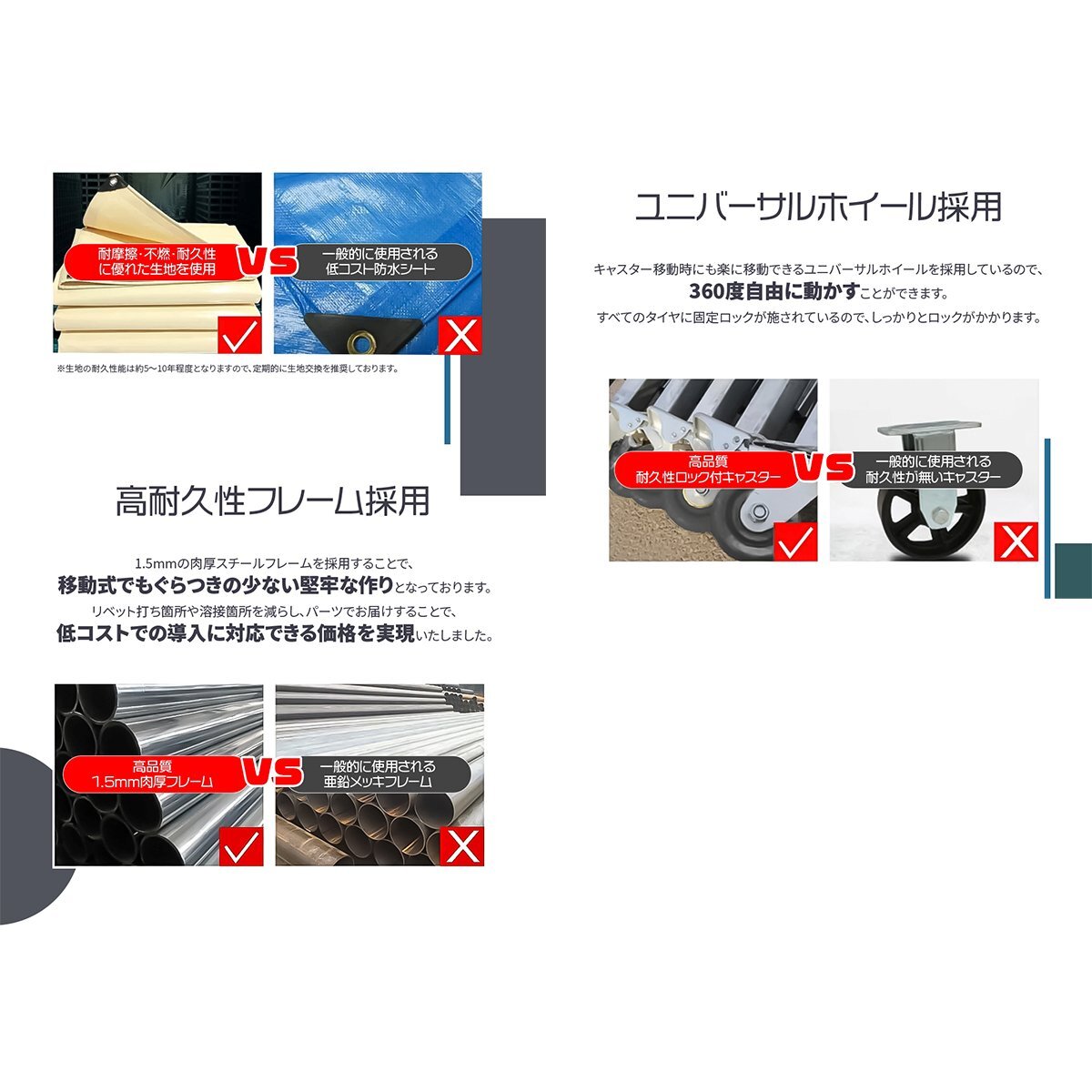 | 内容品 | 屋根生地/側面生地/カーテン生地/屋根前後垂れ生地 足柱(キャスター付き)/屋根骨組/ボルトナット カーテン用ワイヤー/タッピングビス/ 取扱説明書 |