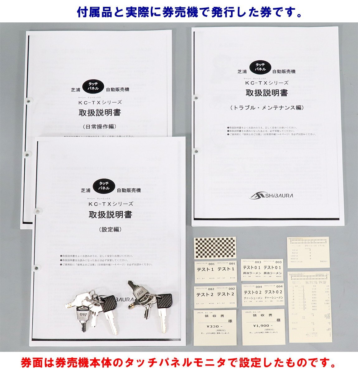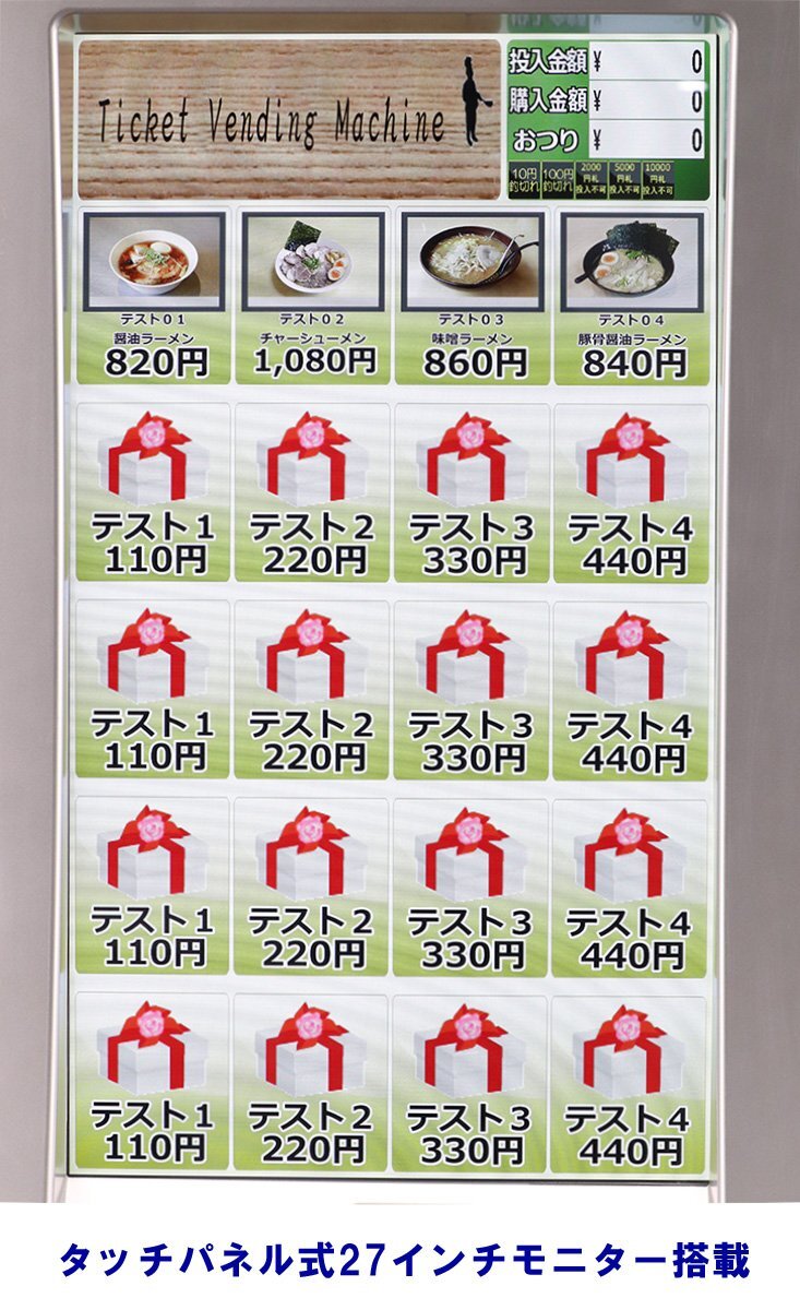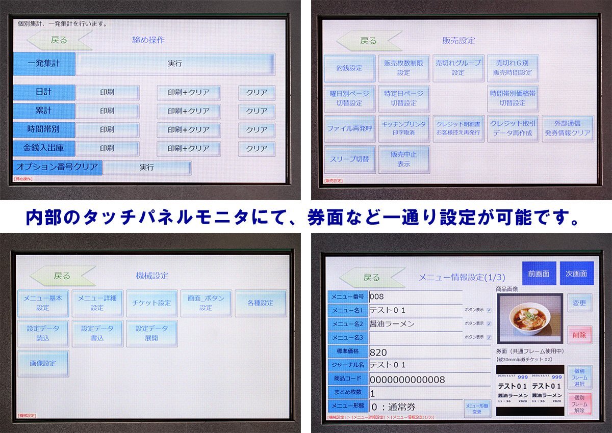 | ■ | 各設定から、紙幣・硬貨の識別、印字、発券、おつりの排出まで一通り動作確認済! 金額やメニュー名などの設定は本体の操作パネルにて変更可能! |