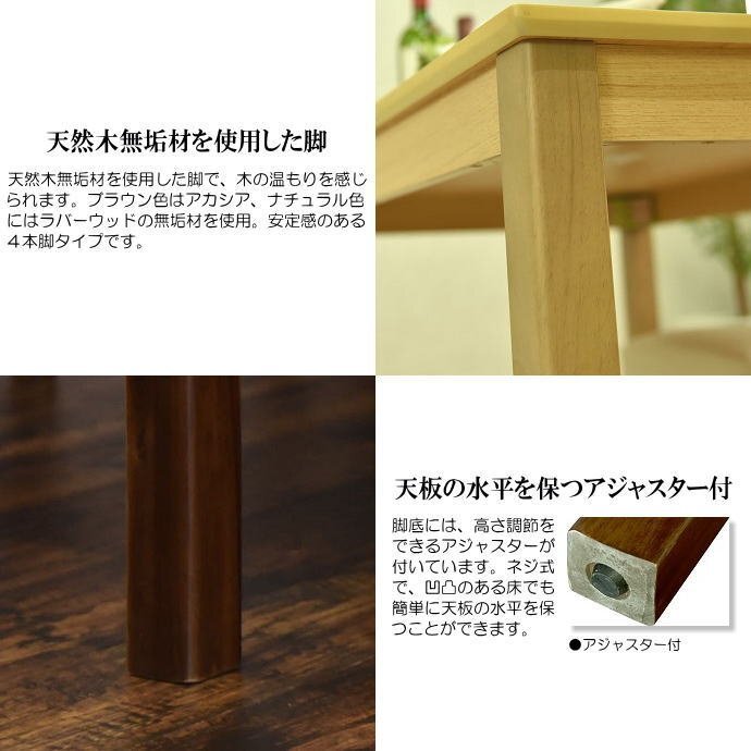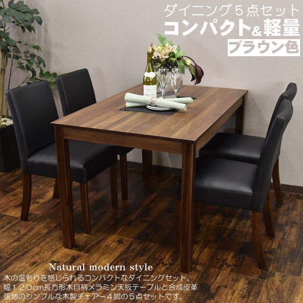 | 【商品特徴】 | ◇木の温もりを感じられるコンパクトなダイニングセット。幅120cm木目柄メラミン天板のテーブルと合成皮革の張地シンプルな木製チェアー4脚の5点セットです。 (チェアーについて) ・狭いスペースでもご利用できるコンパクトサイズで、移動や持ち運びがしやすい軽量タイプです。 ・シンプルなデザインでデスクチェアーや待合の椅子等としてもご利用が可能です。 ・脚部には、天然木のラバーウッド無垢材を使用しています。木の温もりを感じられるナチュラル感あるシンプルな脚部です。 ・張地は、汚れをサッと拭くことができ、お手入れが簡単なブラック色の合成皮革(PVCレザー)を使用しています。 ・ウレタンと合板で構成された中材の座面。しっかり硬めの座り心地です。 ・緩やかに湾曲した背もたれ。フィット感のあるミドルバックタイプです。 ・表面と同じ合成皮革の張地を使用した共張仕上げの背面。すっきりとしたバックスタイルです。 ・開梱後、すぐにご利用いただける組立不要の完成品です。 (テーブルについて) ・天板表面材に、擦り傷や熱に強く飲み物を零してもサッと拭くことができてお手入れが簡単なメラミン化粧板を使用。木目が浮き出た天然木の風合いを感じられるエンボス加工の木目柄でナチュラル感があります。 ・天板木口は、表面と同系色の塗装仕上げ。船底型になって、角を少なくしています。 ・天然木アカシア無垢材を使用した脚で、木の温もりを感じられます。安定感のある4本脚タイプです。 ・脚底には、高さ調節をできるアジャスターが付いています。ネジ式で、凹凸のある床でも簡単に天板の水平を保つことができます。) ) ・表面材と同じ木目柄メラミンを、天板裏面にも貼っています。天板の反りを防ぎ、見た目にも綺麗です。 ・お客様で、脚のお取り付けが必要となっております。脚1本につき、ネジ2本でお取り付け下さい。説明書・工具の六角レンチを付属しています。 |