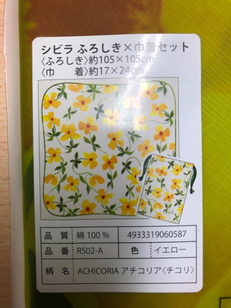 柄名 :アチコリア (チコリ) ふろしき :約105㎝×105㎝ 巾着 :約17㎝×24㎝ 素材 :綿100%