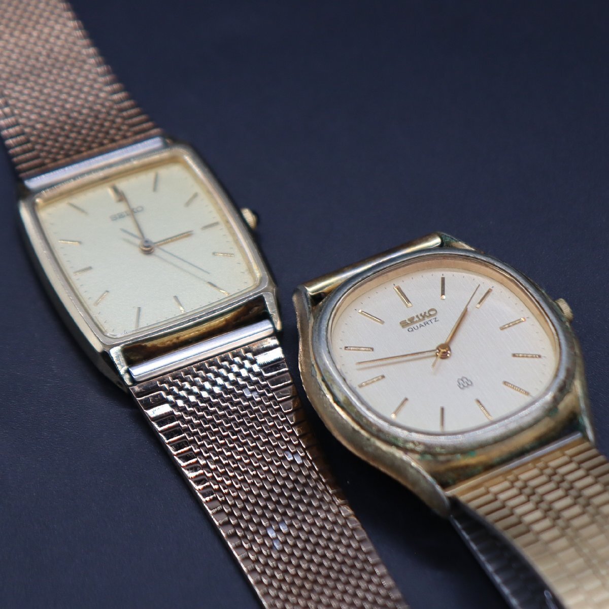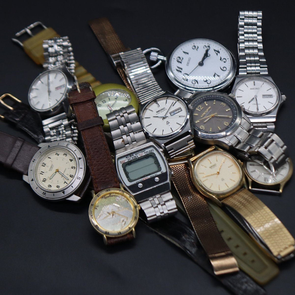 13本おまとめ、お買い得ジャンクセットです。 セイコーなどの国産腕時計を中心に、海外品や懐中時計も含みます。 基本的には不動で、おそらく動作品もあるかとは思いますが パーツ有無含め詳細全て未確認です。 あくまでも部品取り用としてご入札ください。 全体に経年なりの傷・汚れなどございます。 おまとめジャンクセットとして出品しておりますので、 状態については全て画像にてご判断願います。 | |