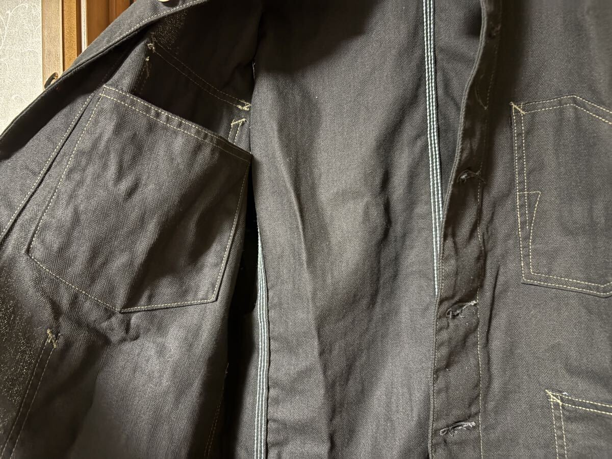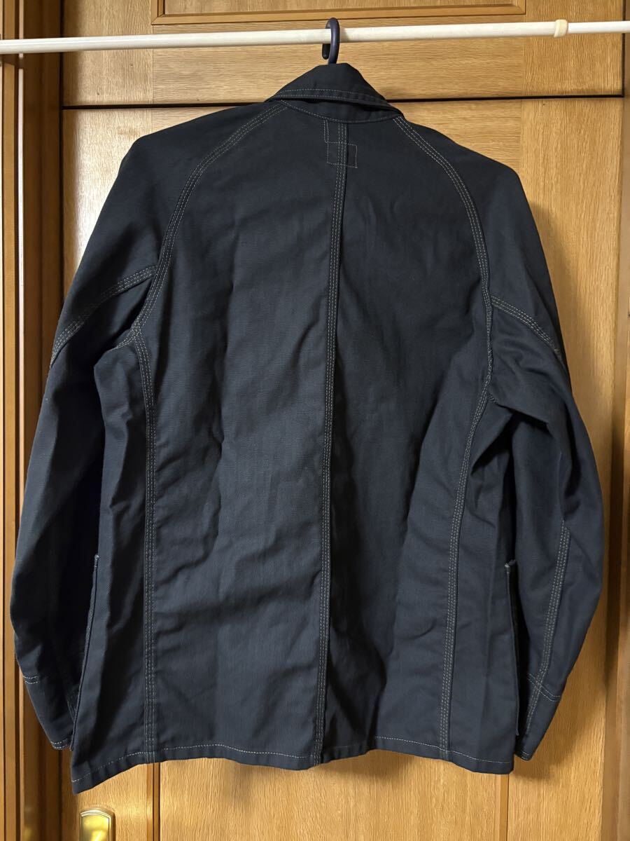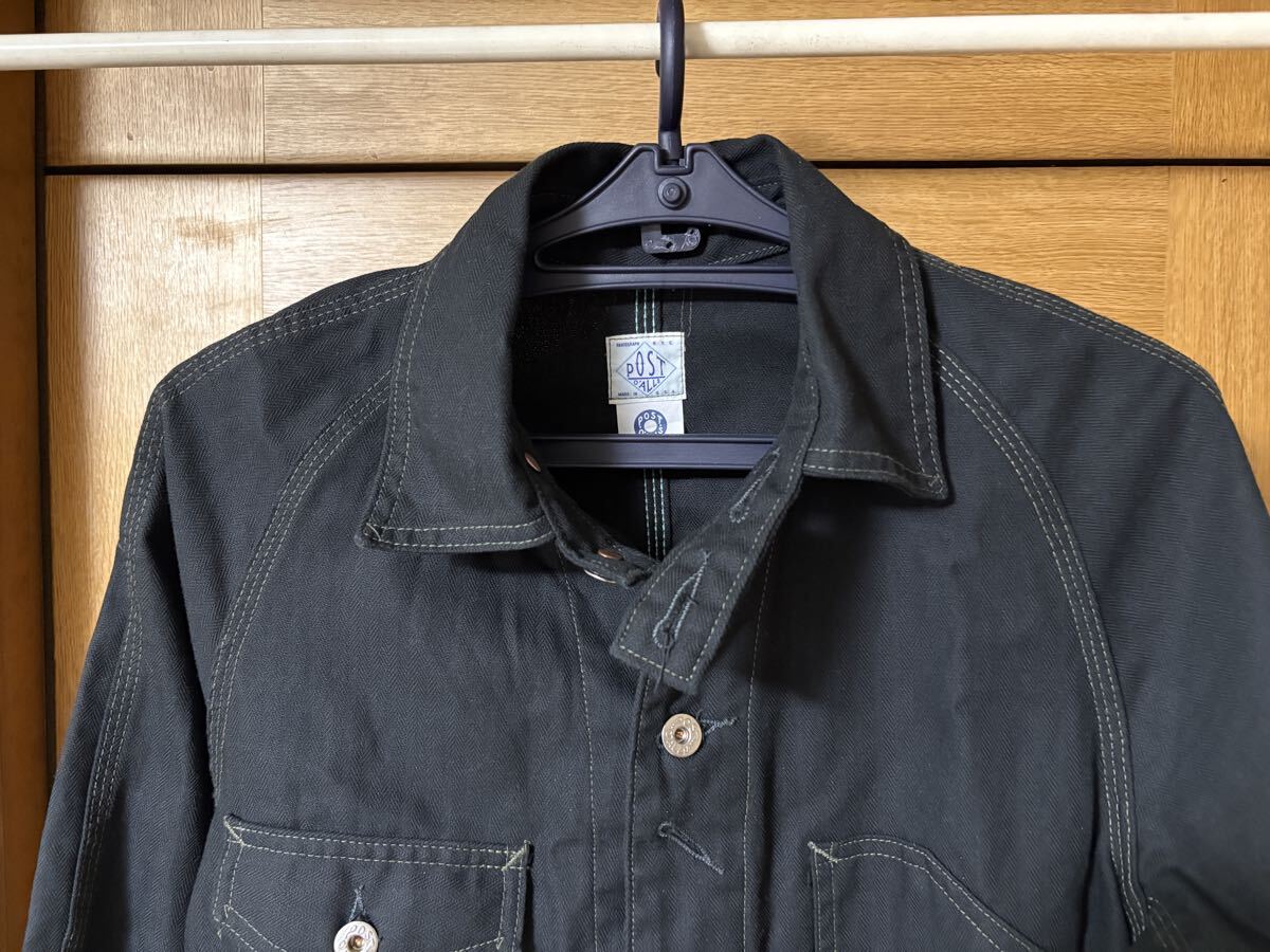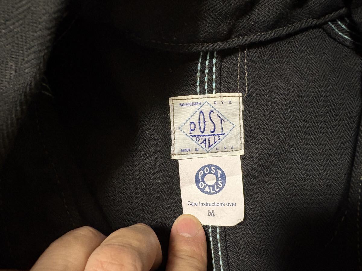 POSTOVERALLS ポストオーバーオールズ ヘリンボーン織カバーオールです。使用感少なく、汚れやダメージの無い美中古品です。サイズはMで、おおよその寸法が 身幅54 着丈68 裄丈84 といったところです。ポスト定番のカバーオール(エンジニアーズジャケット)です。黒のヘリンボーン織の生地がとても渋くてカッコいいです。米国製時代のものとなります。お好きな方、いかがでしょうか?よろしくお願いいたします。
