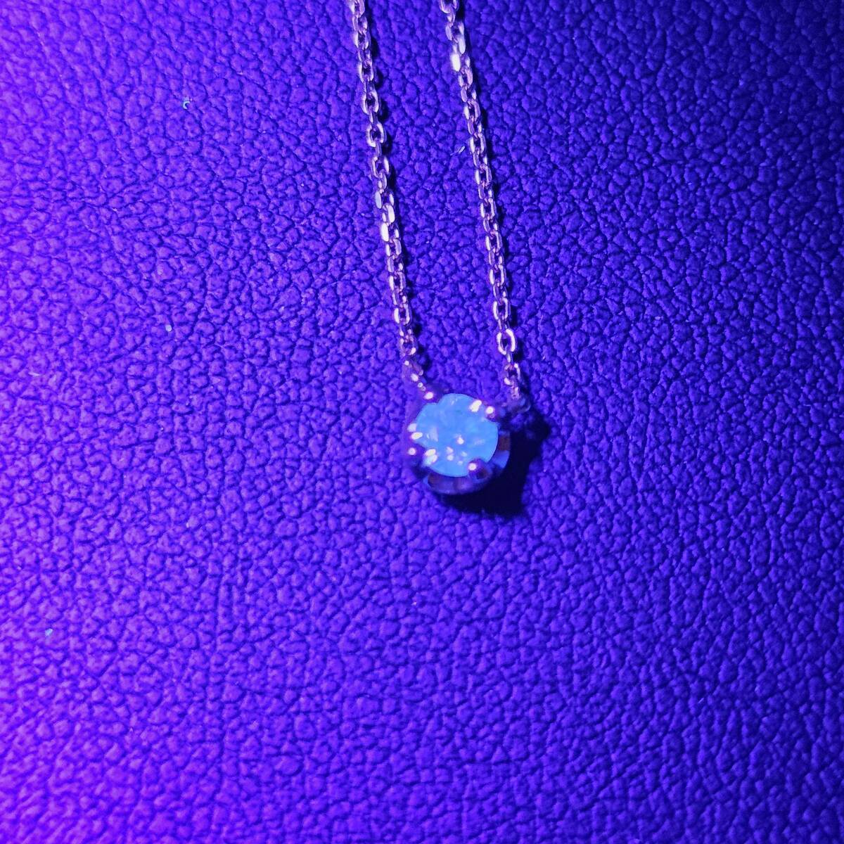 写真のようにブラックライトを当てるとダイヤモンドがしっかり蛍光反応を示します。これは、天然ダイヤモンドが持つ「蛍光性」という性質によるもので、**天然石であることの証明**になります。 (※蛍光反応の強弱はダイヤモンドの価値には影響しませんのでご安心ください。)