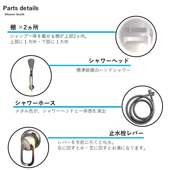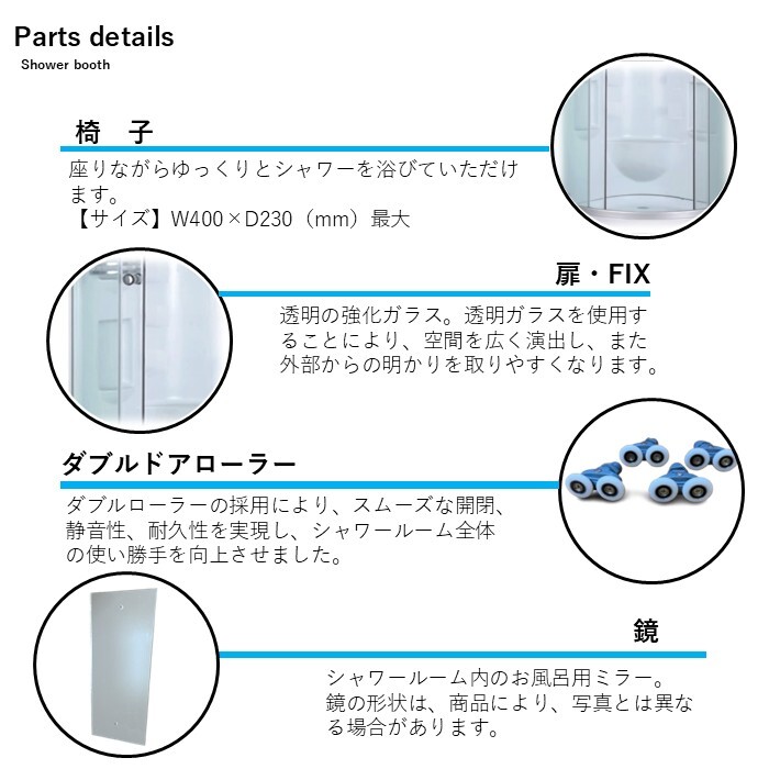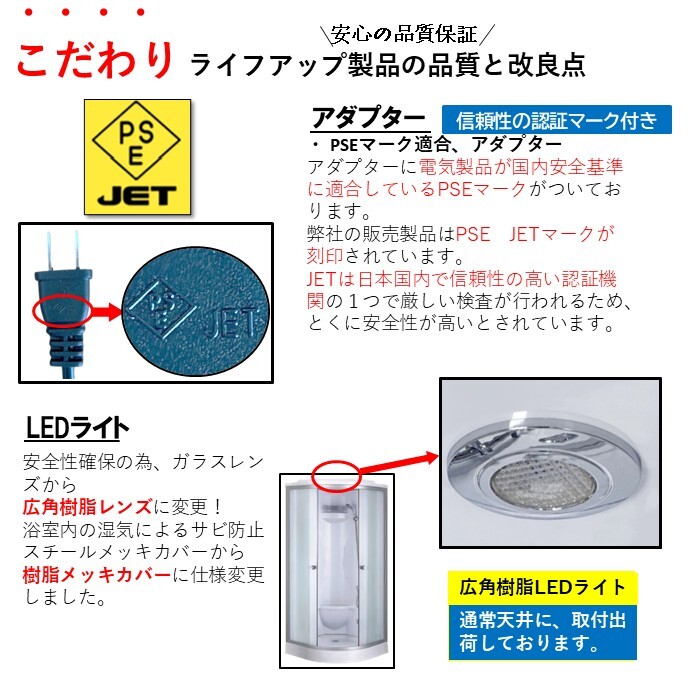室内にゆとりがあり、椅子もついているため、ゆったりとシャワータイムを楽しむことができます。 LEDライトや換気ファンを備えたシャワーユニットがこのお値段です! 前面ガラスは半透明シルクガラス(強化ガラス)を使用、光を通しシルエットは映りますが、中の様子は見えません。 シャワールームに必要な機能を厳選したハイクオリティモデル。 商用・家庭用、どちらにも適した汎用性の高いモデルです。 本商品は組み立て式の商品です。 組立説明書がございますので、お客様ご自身で簡単に組み立てることが可能です。 組立作業は工具を使える方2名で、2時間~半日程度で設置可能です。 (コーキングの時間は含まれておりません。) シャワー等の水栓金具は背面パネルに取り付け済ですので、組立家具のようにビスで床パネルや背面パネル等を固定するだけで簡単に設置できます。その後コーキングと給排水の繋ぎ込みを行います。 この価格でシャワーの増設、リフォームが可能です!! 商品説明最後に、各注意事項をのせております。 必ず、ご購入前にご確認下さい。 【商品紹介動画】YouTubeで商品紹介動画をご覧いただけます。 ※YouTubeで同タイプの商品紹介動画をご覧いただけます。 【組立解説動画】組立方法を詳しく解説した動画もございます。ご自身で組み立てされる際も安心です。 (※lifeup-016は、lifeup-014と同じ組立方法です。) 【lifeup-010 lifeup-014】シャワーユニット組立解説動画その1:商品の開梱方法について 【lifeup-010 lifeup-014】シャワーユニット組立解説動画その2:本体の組立方法について 【lifeup-010 lifeup-014】シャワーユニット組立解説動画その3:扉・天井パネルの取り付けについて 【lifeup-010 lifeup-014】シャワーユニット組立解説動画その4:配線・防水工事について ※海外輸入品の為、サイズ、組み立てに若干誤差があり、細かなキズや汚れ等がある場合がございますのであらかじめご了承の上ご購入ください。 | ||||||||||||||||