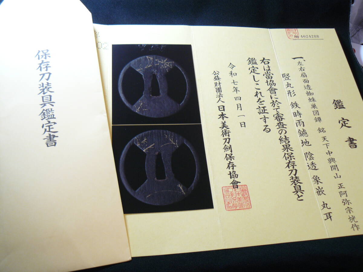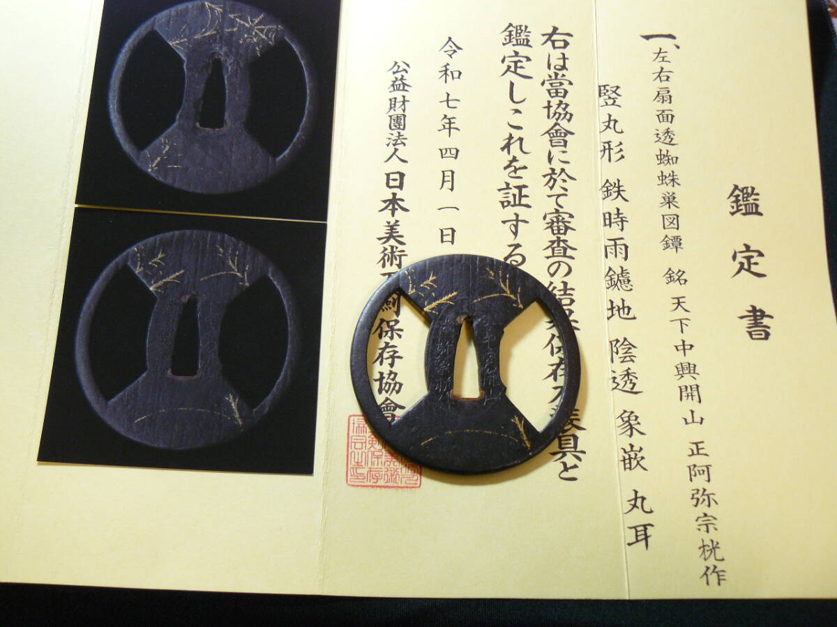| 名品 保存刀装具 鑑定書付き 鐔 『天下中輿開山 正阿弥宗光作』 蜘蛛巣象嵌 林又七 江戸時代 重要文化財の如し 名品 拵 見事! |