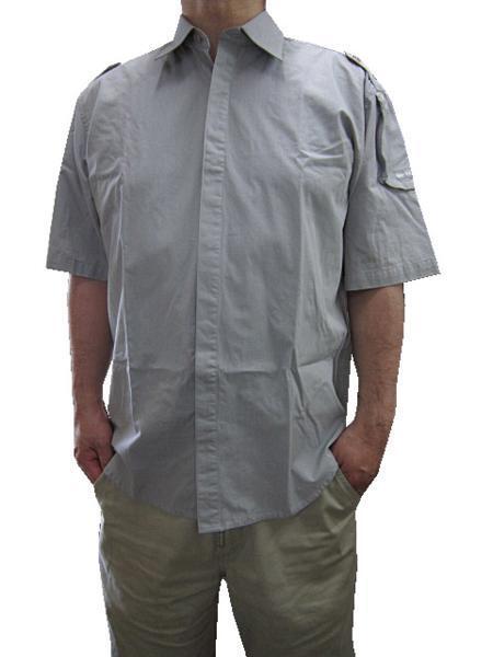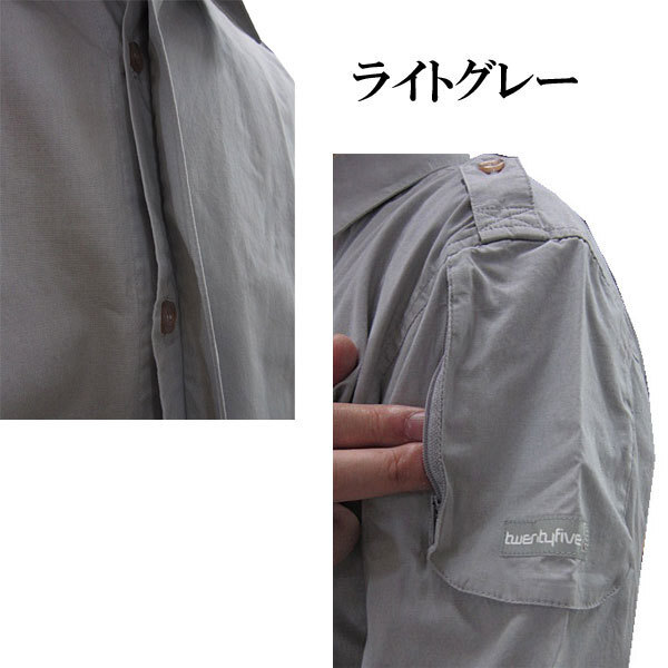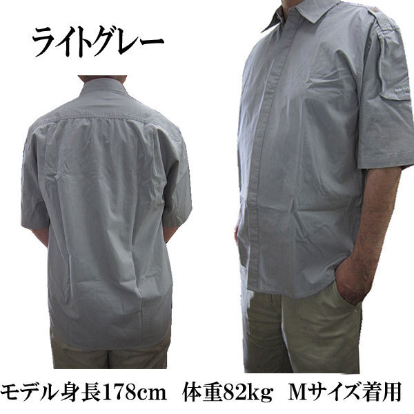 TWENTYFIVE (トゥエンティーファイブ)半袖シャツ BD283 ライトグレー(M)です。 ■素材 コットン100% ■サイズ 身幅約52cm 着丈約60cm 着丈約79cm ■特徴 フロントは比翼仕立てでボタンが隠れますので、シンプルな着回しに便利な1枚です。 両肩にボタン付きで、左そでにZIPポケット付き。 | ||||||