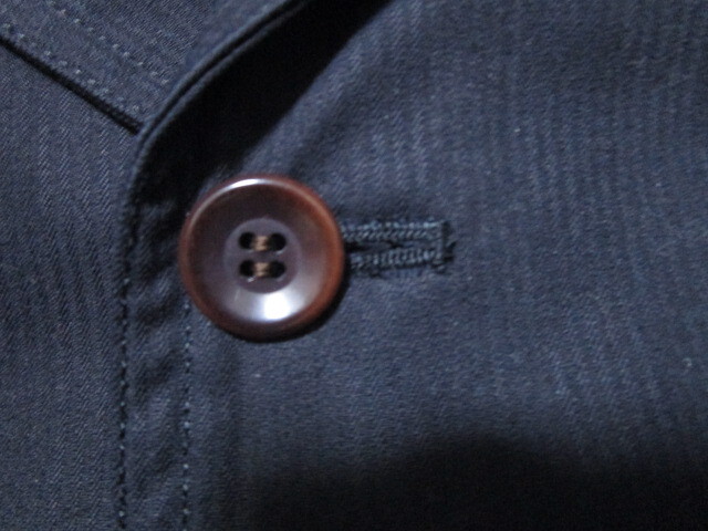 | ★商品説明★ | うっすら無地ストライプの入ったブラックのコットンジャケット☆オープンカラーでトップボタンもあるので上までしめればレギュラーカラーになります☆綿100%☆日本製☆表記サイズはL、平置き、肩幅約47cm、身幅脇下約54cm、着丈(背面、襟下から)約74㎝,袖丈約62㎝です。(素人寸)。 古着としてはこれからのお品だと思います。 |