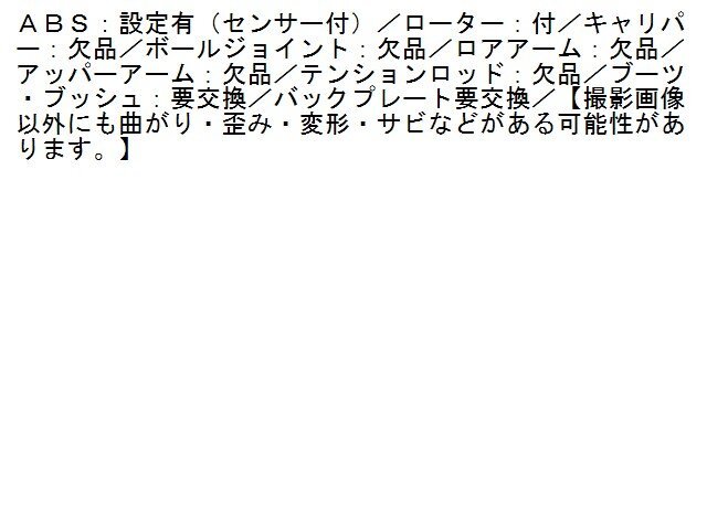 | 商品情報 | ABS:設定有(センサー付)/ローター:付/キャリパー:欠品/ボールジョイント:欠品/ロアアーム:欠品/アッパーアーム:欠品/テンションロッド:欠品/ブーツ・ブッシュ:要交換/バックプレート要交換/【撮影画像以外にも曲がり・歪み・変形・サビなどがある可能性があります。】 | ||