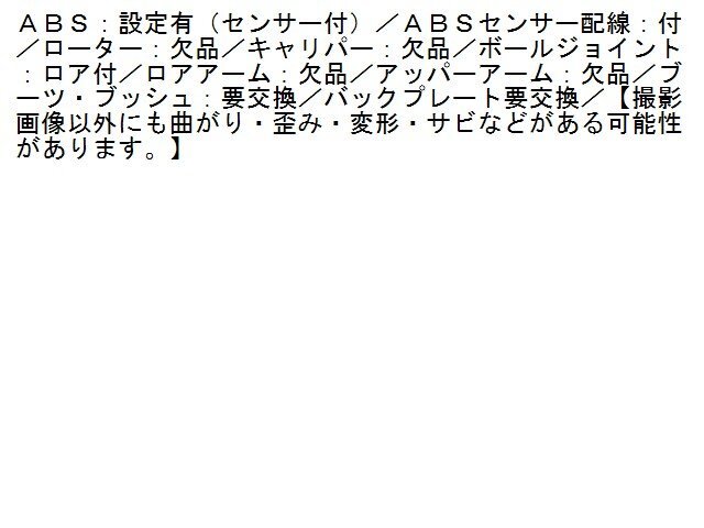 | 商品情報 | ABS:設定有(センサー付)/ABSセンサー配線:付/ローター:欠品/キャリパー:欠品/ボールジョイント:ロア付/ロアアーム:欠品/アッパーアーム:欠品/ブーツ・ブッシュ:要交換/バックプレート要交換/【撮影画像以外にも曲がり・歪み・変形・サビなどがある可能性があります。】 | ||