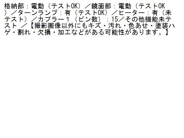 | 商品情報 | 格納部:電動(テストOK)/鏡面部:電動(テストOK)/ターンランプ:有(テストOK)/ヒーター:有(未テスト)/カプラー1(ピン数):15/その他機能未テスト /【撮影画像以外にもキズ・汚れ・色あせ・塗装ハゲ・割れ・欠損・加工などがある可能性があります。】 | ||