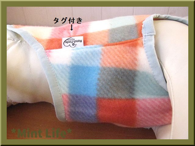 | *商品詳細* 商品名: *Mint Life* ハンドメイド 「ドッグウェアー」 Mサイズ 4~6kg 使用生地: チェックフリース生地(ポリエステル100% ) サイズ: M寸 (小型犬? 4~6kg適用) 背丈 29㎝ / 前丈 27㎝ /身幅 25㎝ 首回り 33㎝ / 袖回り 30㎝ 重さ: 約42g (梱包前) (採寸の誤差はご了承ください。) *形の説明* 暖かフリースのドッグウェアーで、後面プラスナップボタン開きのシャツ型です。 首周りと袖回りと裾周りはニットテープで巻いています。 生地の厚みがあり、リードを付けるDカン2個付きでお散歩が出来ます。 ※モデル犬がいないため、ぬいぐるみに着せていますが、小型犬?4~6㎏の犬対応です。 ※長年洋裁をしています母が手作りしています。 職業用ミシンで縫っています。 | |||