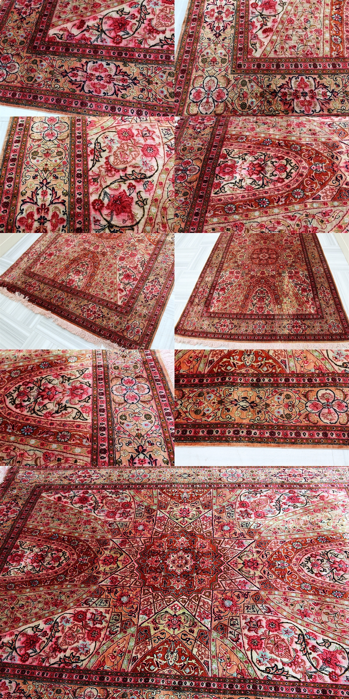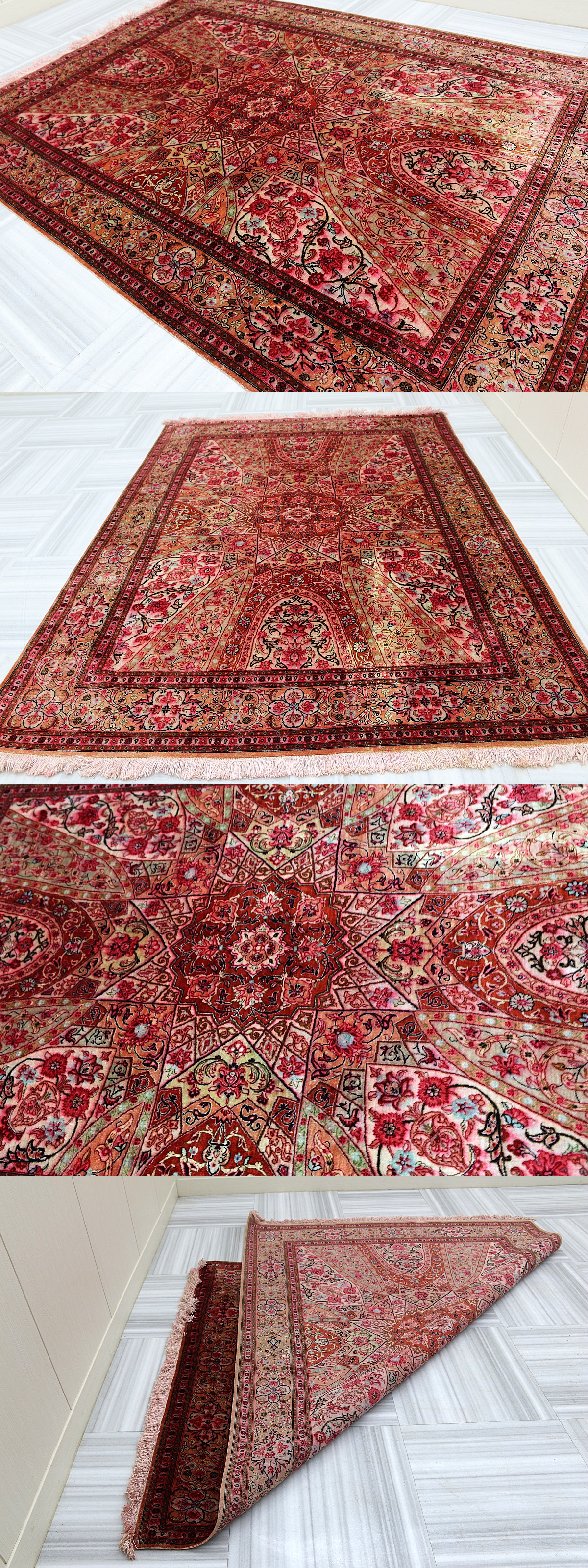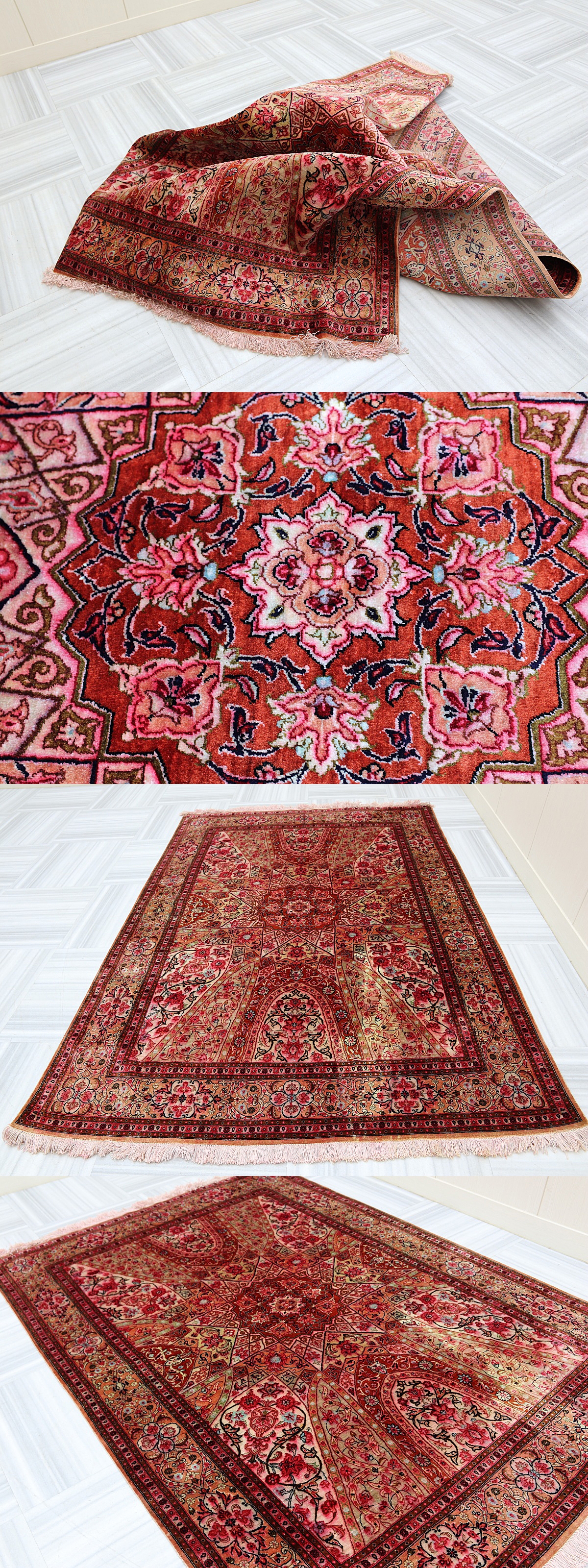 | ★ご覧いただき誠にありがとうございます★ ◆サイズ:約-198×140cm(フリンジ含まず) 【ペルシャ絨毯 クム産】 テヘランから南へ約120kmに位置する街クムは、シルク絨毯の代表的産地です。伝統あるカシャーンの伝統工芸の一つでその価格は他の産地を圧倒しています。シルク100%で織り上げている為、手触りは柔らかくそのしなやかで繊細な品質は他を圧倒するほどの出来映えです。シルク絨毯は角度によって色合いは薄く見えたり、濃く見えたりしますのでウール絨毯とは全くの別物です。手触りも柔らかく最高の質感を与えてくれます。一つ一つを手織で編み上げる、時間と労力を無視した工法は、良いものを作る信念が無ければなせない業です。手織り絨毯は、その織り特性や素材の特性からみても非常に耐久性があります。年月と共にますますその風合いの良さが醸し出されることでしょう。 ◆イラン・クム産。緻密に織られたシルク100%手織りペルシャ絨毯の出品です。非常に細かく織られた赤基調のすばらしい作品です。約30年前の購入との事でセミオールドの分類かと思います。何とも言えないすばらしい色合いになっております。 状態は悪くありませんが、全体的に経年の色落ちがみられます。所々赤い花部分が滲んでいるように見えます。最高級のペルシャ絨毯は花や草からなる天然素材の塗料を使用している為、少しの事でこのようになってしまいます。ペルシャ絨毯でも安物は色落ちしません。これも最高級絨毯の証ですので、良い意味で味としてお楽しみいただければ幸いです。 写真、所々白く光って見えるのは絹が光で反射しているからです。見る角度によって色合いが違って見えるのは、シルク絨毯の特徴でもあります。 佐川急便にて、本州送料無料(沖縄・北海道エリア+3,000円※離島の方は要相談願います。)でお届けいたします。最高級クム産ペルシャ絨毯をこの機会にご検討下さい! ●あとはすべて写真にてご審査願います。写真には写りきらない、よごれやダメージ、詳細部分の、記載ミスなどがもしあっても、その旨のクレームはご勘弁下さい。上記内容をご理解頂き、ノークレーム・ノーリターンでお願いいたしいます。 |