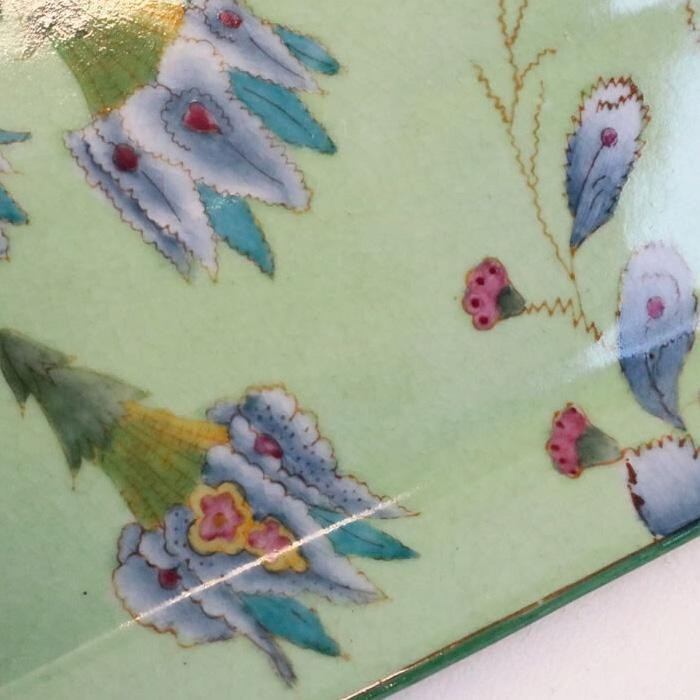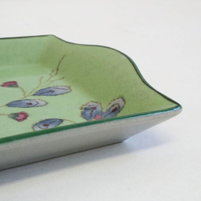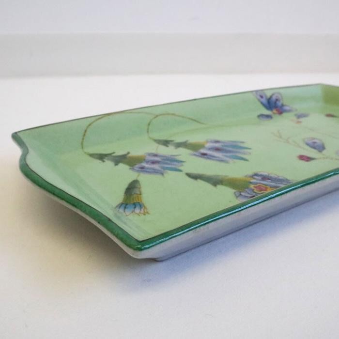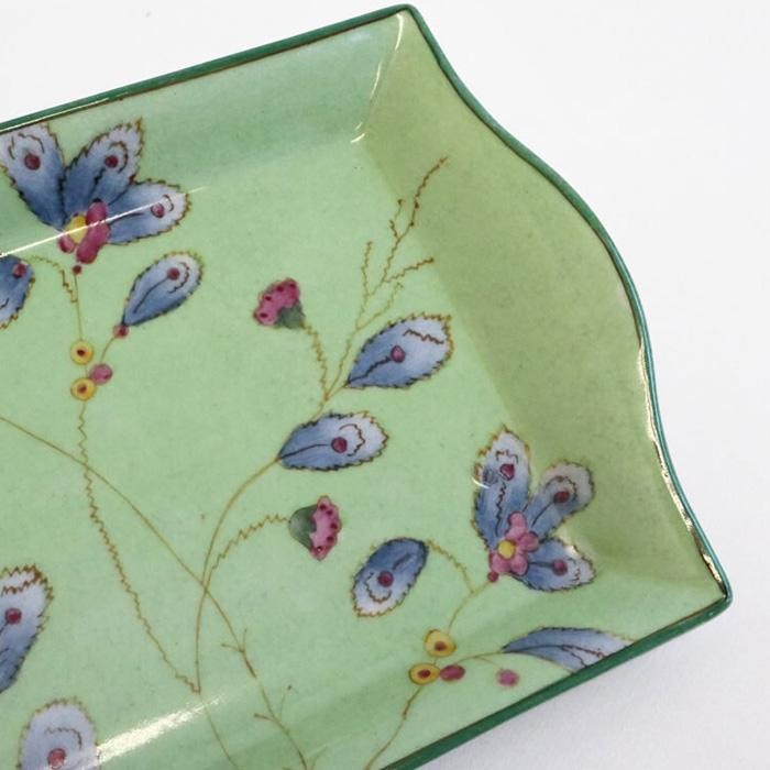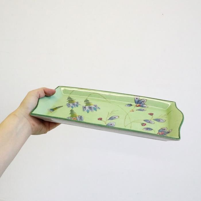 | 手描きで描かれたユニークな模様の磁器トレイ。 |