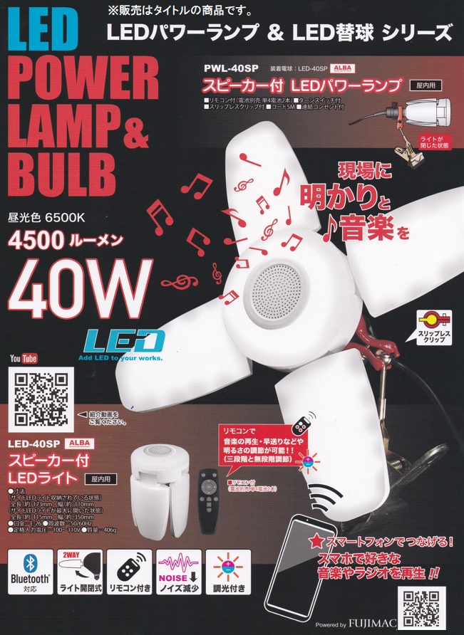 フジマック FUJIMACスピーカー付 LEDライト 40W 屋内用LED-40SP■特長・スマートフォンでつなげる!スマホで好きな音楽やラジオを再生!!・リモコンで音楽の再生・早送りなどや明るさの調整が可能!!(三段階と無段階調整)■付属品・リモコン(電池別売)■仕様・寸法(サイドLEDライト収納されている状態):全長約173mm・幅約110mm・寸法(サイドLEDライトが最大に開いた状態):全長約115mm・幅約350mm・明るさ:4500lm・昼光色:6500K・消費電力:40W・口金:E-26・周波数:50/60Hz・定格入力電圧:100~110V・質量:406g