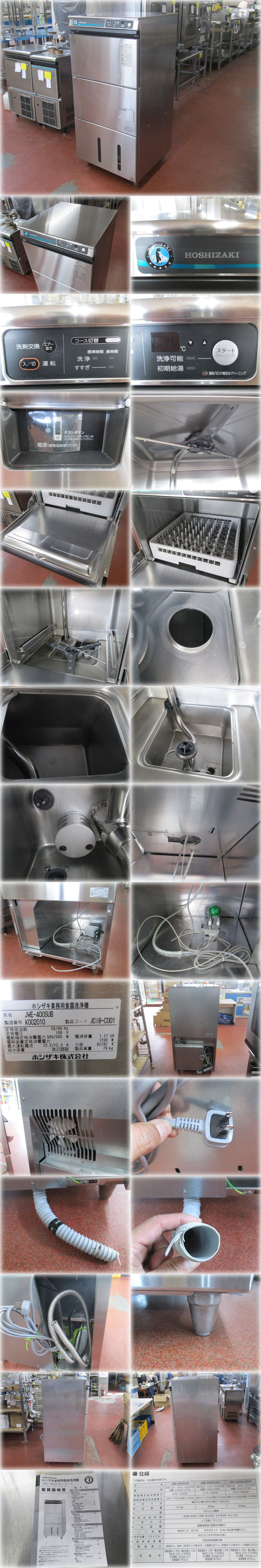 ホシザキ 小形ドアタイプ食器洗浄機 JWE-400SUB を出品いたします。 ■特徴■ 省エネモードで消費電力量をセーブ 待機状態で一定時間が経過すると、 すすぎタンクヒーターの設定温度を自動的に下げて、 消費電力を抑えます。 次の運転が始まると解除されて、通常温度に復帰します。 湯気漏れを減らし、作業環境をより快適に 洗浄機本体にパッキンを取り付け、 洗浄中に庫内から漏れる湯気を抑制します。 残菜はフィルターひとつでしっかり収集 残菜はバスケット形タンクフィルターひとつで しっかり収集できます。 また、把手は可動式なので フィルター内の掃除も容易にできます。 洗浄タンクはゴミのたまりにくい絞り構造 絞り構造で突起物の少ない洗浄タンクは、 ゴミがたまりにくく、 掃除もしやすい衛生的な設計です。 庫内部品を外さず、 洗浄水に触れることもなく排水が可能 油や洗剤で汚れた、高温の洗浄水に 手を入れる必要がなく清潔で安全です。 また、洗浄ポンプ内も排水されるので衛生的です。 ハーフサイズの洗浄剤・リンス剤を収納 本体正面の下部部分に、 ハーフサイズの洗剤・リンス剤タンクスペースを用意。 天井に傾斜 天井に傾斜をつけることにより洗浄水の後ダレを防ぎ、 すすぎの仕上がりを向上させます。 効果的なすすぎを実現 すすぎ時に、上すすぎノズルから 上方向にもすすぎ水を噴射。 洗浄ノズルや天井もすすぎます。 ■仕様■